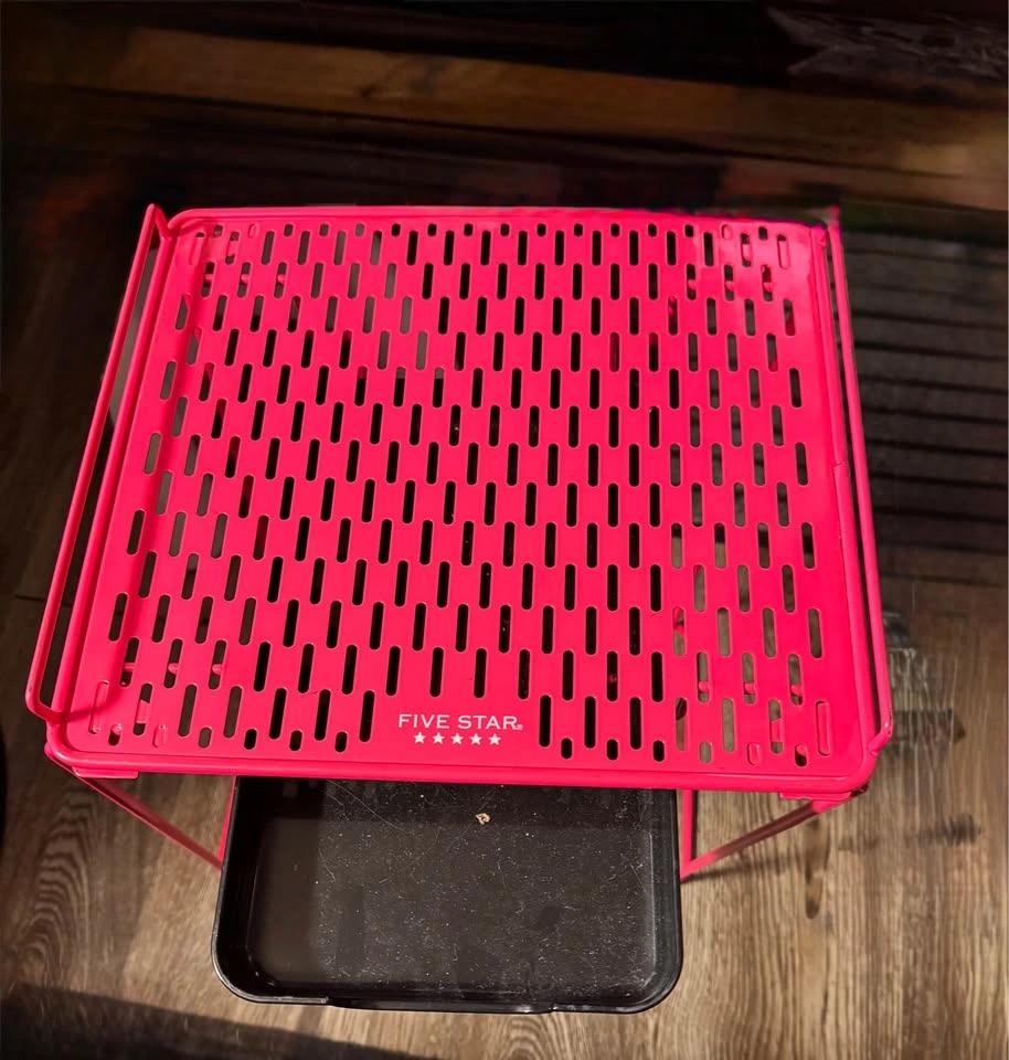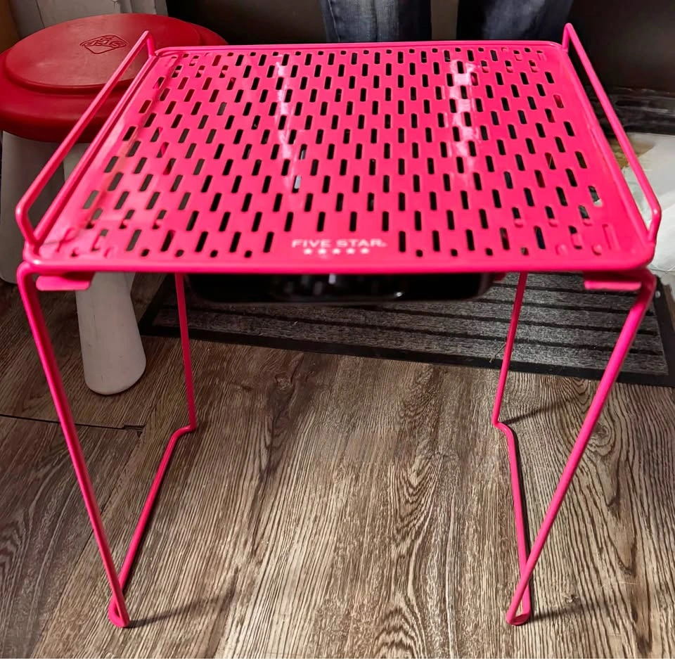 This vibrant pink Five Star locker shelf, with dimensions around 12 inches by 12 inches, is a fantastic addition to any locker, offering an extra tier of organization! It's in used condition, ready to bring a pop of colour and functionality to its new space. Perfect for keeping your school essentials neatly arranged. I like to think this shelf has seen its fair share of textbooks and secret notes, adding a bit of character to its sturdy frame.
