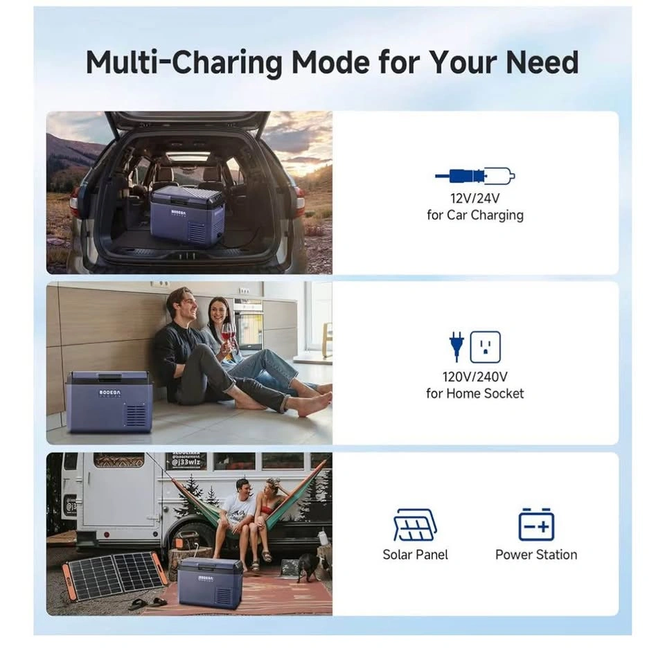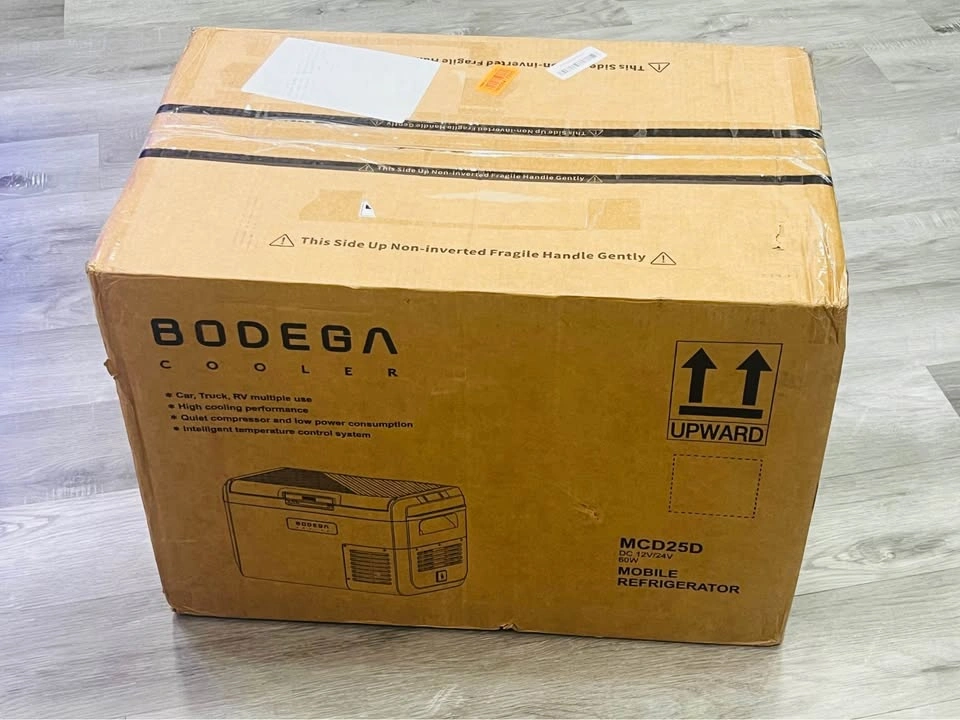 Keep your beverages and snacks chilled on the go with this BODEGACOOLER 12 volt car refrigerator! This portable freezer has a 26 quart (25L) capacity and is designed with an IPX4 waterproof rating, making it perfect for truck, van, camping and road trips. It can operate on both 12/24V DC and 110-240V AC, and it has a temperature range of -4°F to 68°F. This cooler is in new condition.