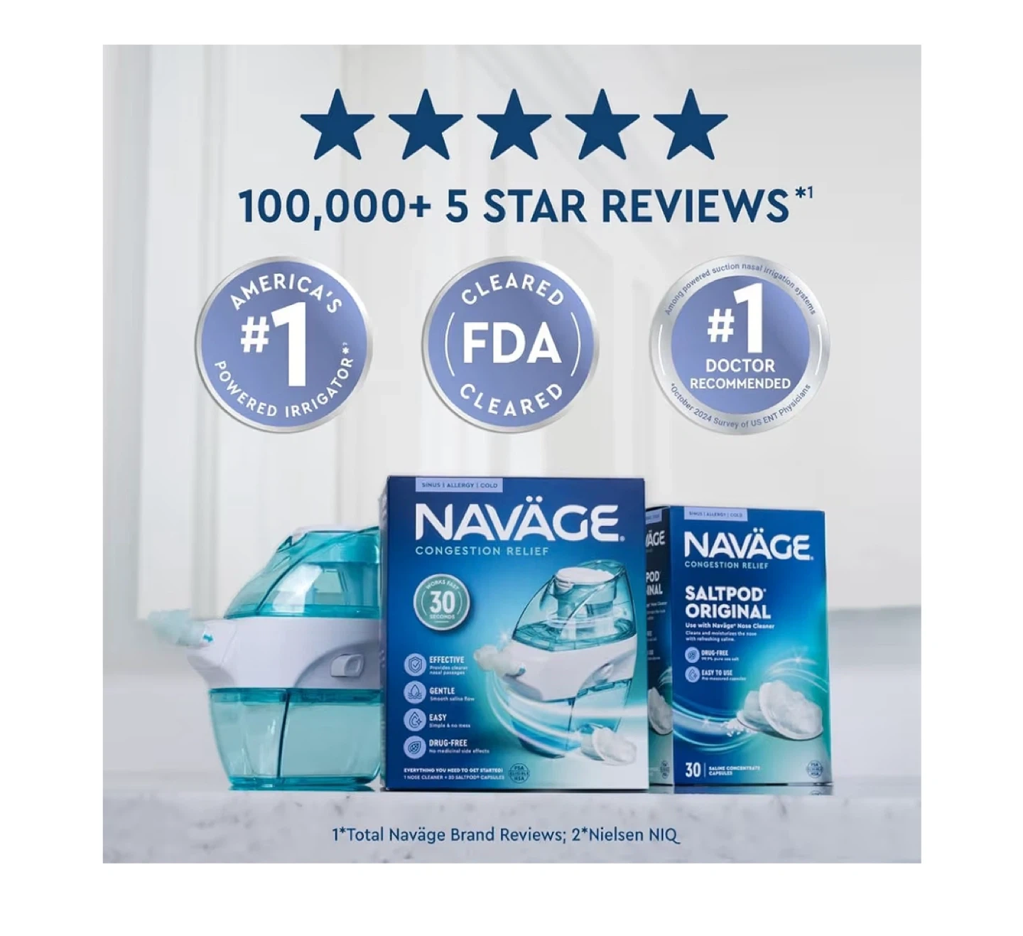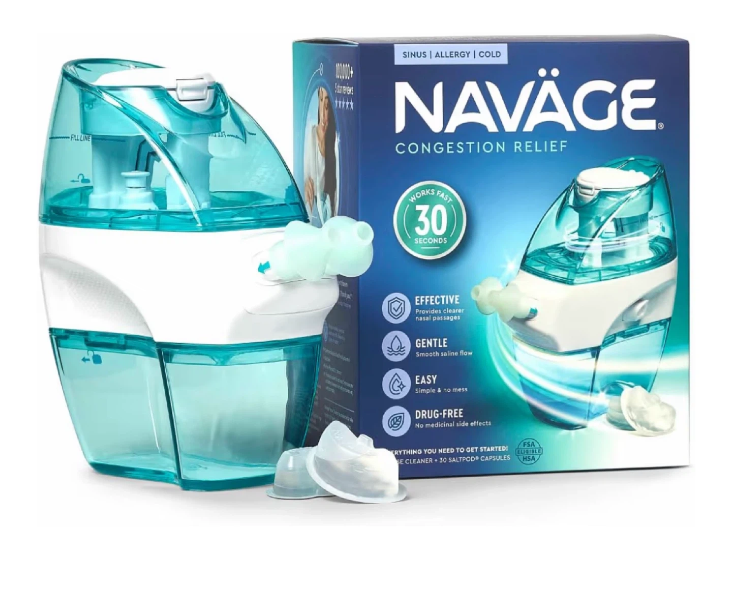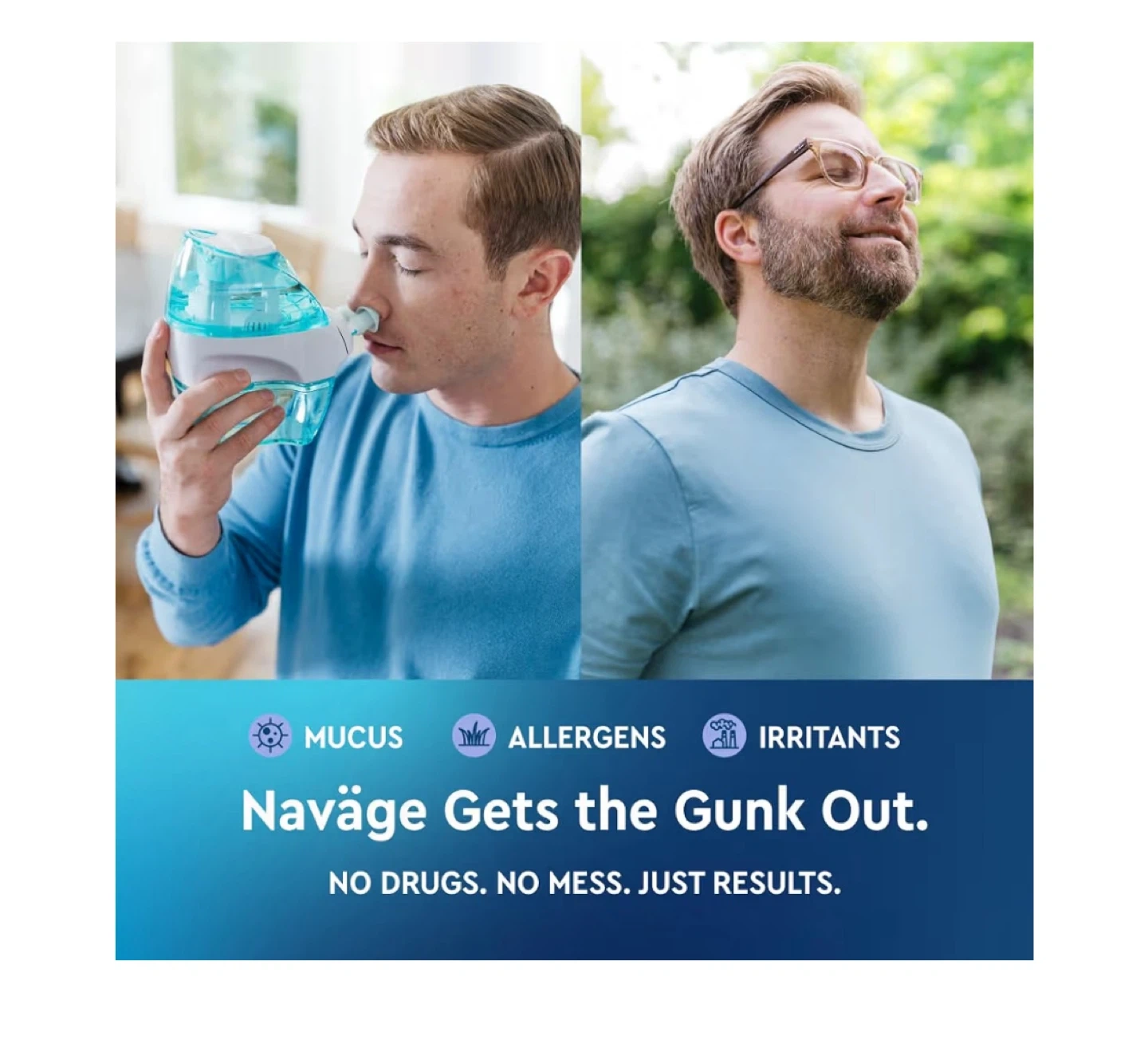 5I'm selling a Naväge Nasal Congestion Relief System. It works faster than steroid sprays and over-the-counter pills, providing relief in just 30 seconds. It features an easy hand-held form with a comfortable grip, one-button control, and pre-dosed SaltPod capsules for no mess and no guesswork. Plus, it comes with a full range of accessories for customizable comfort. Naväge gets the gunk out, offering a drug-free solution with no medicinal side effects