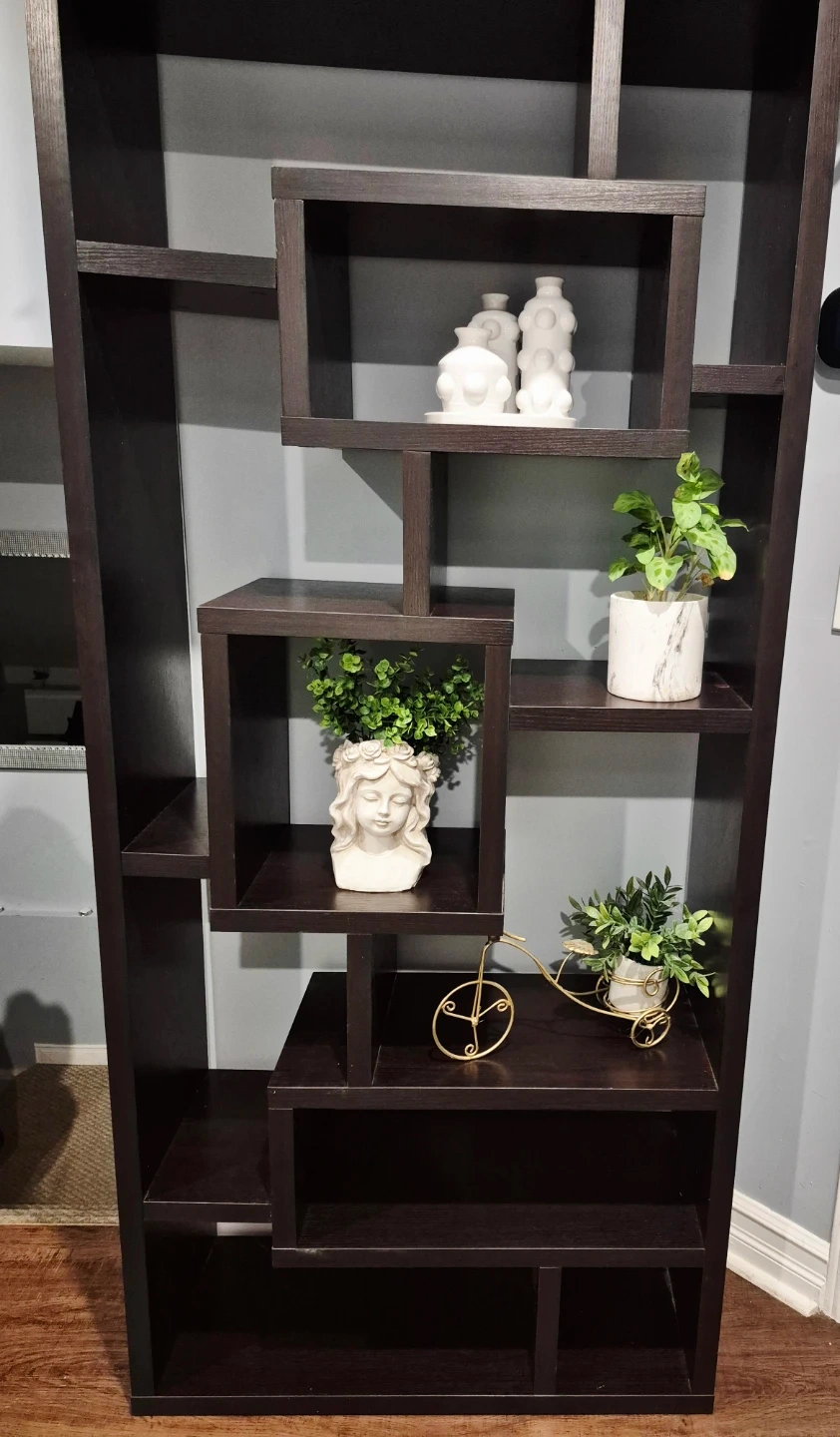 Selling a dark brown bookshelf with a unique geometric design. It's a great piece to add some visual interest to your space and provides ample storage for books and decor.