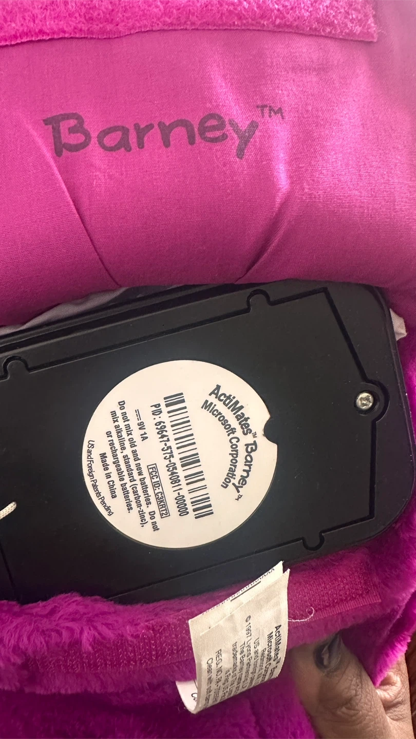 Vintage 1997 ActiMates Barney Plush Microsoft Talking Singing Interactive 14”. Very clean. Battery compartment (needs to be opened by screwdriver). It is currently dead but I will switch out the batteries for interested buyer. Works. Selling in as is condition. No returns.