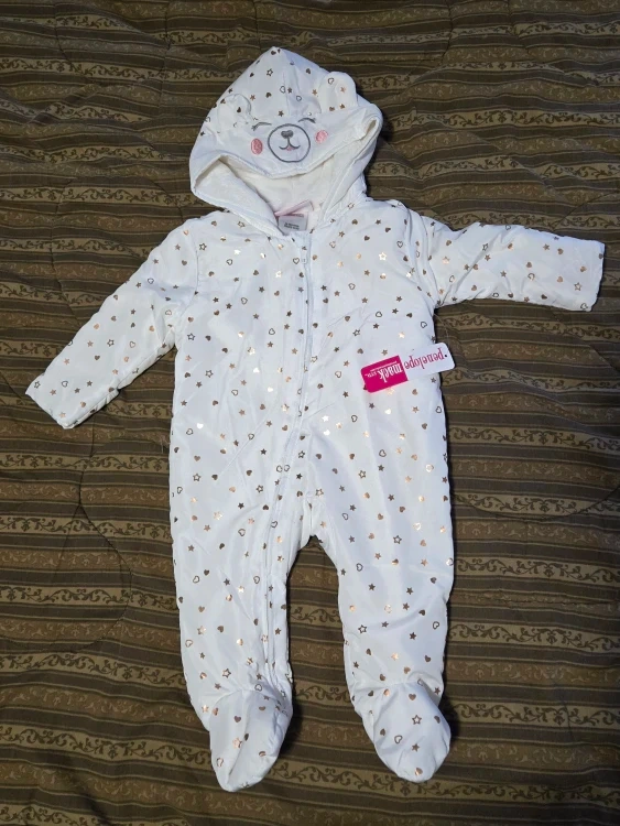 A super cute Penelope Mack baby snowsuit, perfect for keeping your little one warm this winter! It's white with gold stars and hearts, and has an adorable bear face on the hood. Size is 3/6 months.