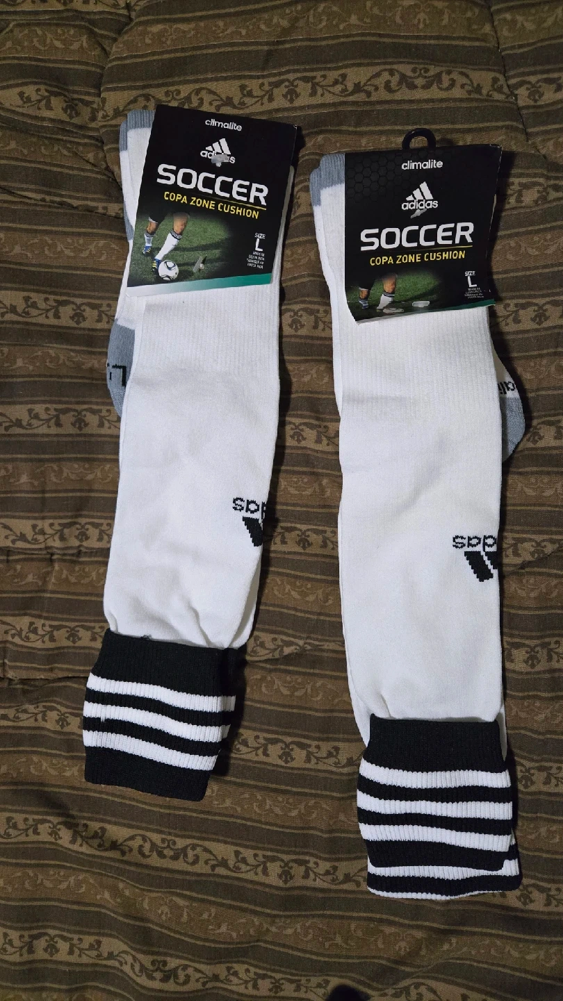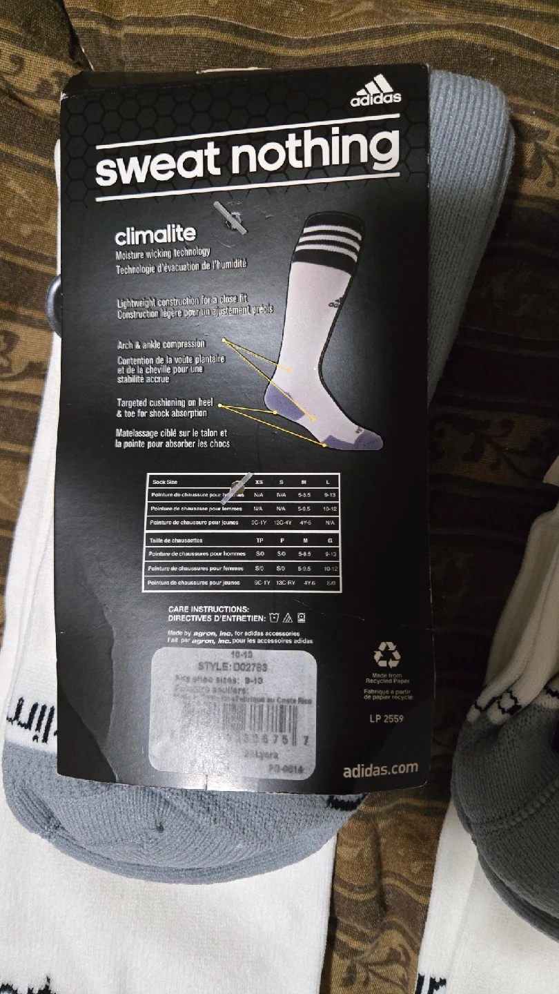 Selling a pair of Adidas Sweat Nothing soccer socks in size L. They feature Climalite moisture-wicking technology to keep you dry and comfortable. Lightweight construction for a close fit, with arch and ankle compression for added stability. Targeted cushioning on the heel helps absorb shock