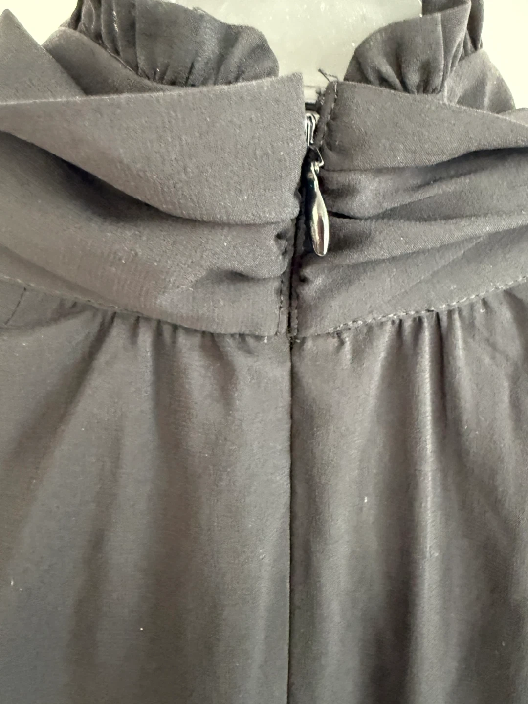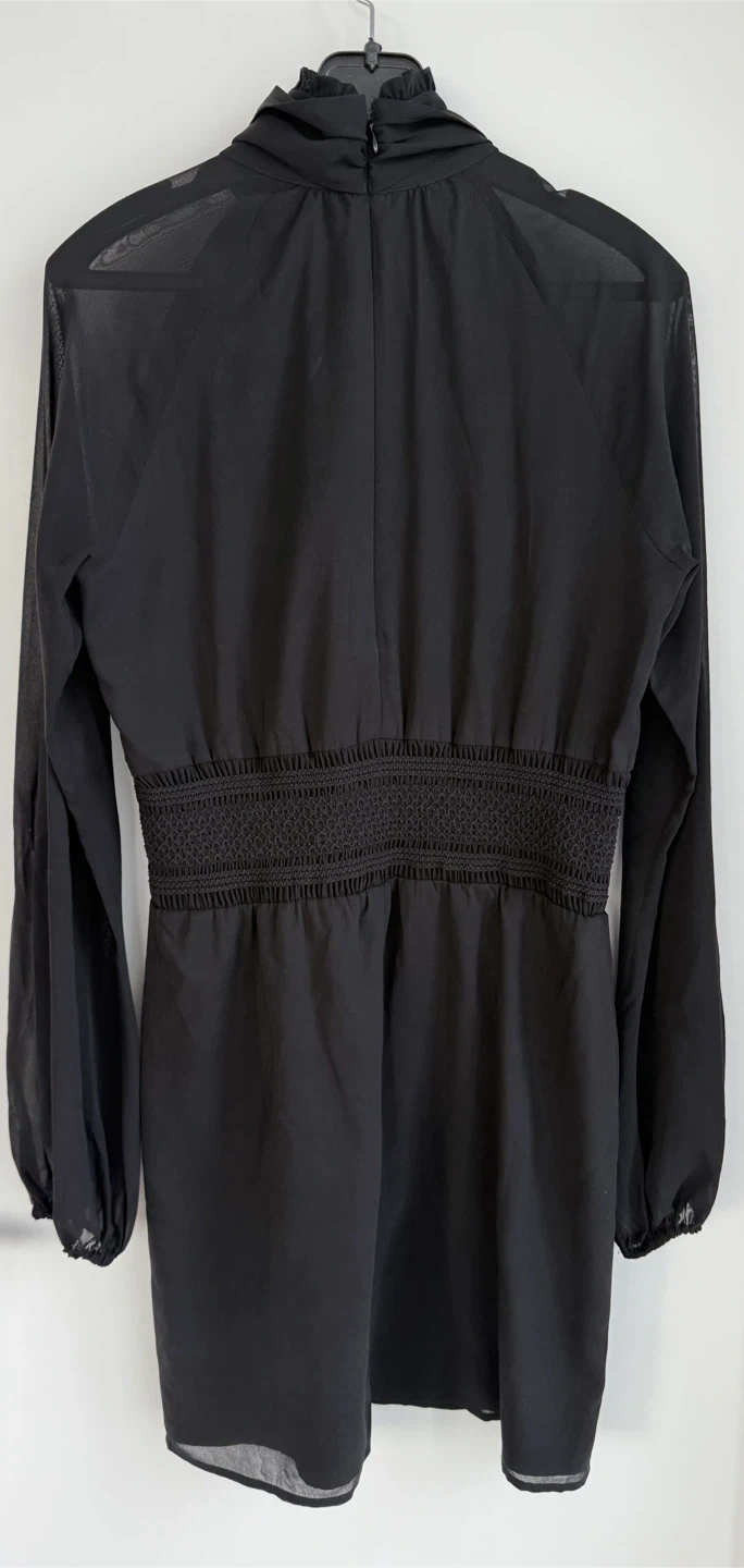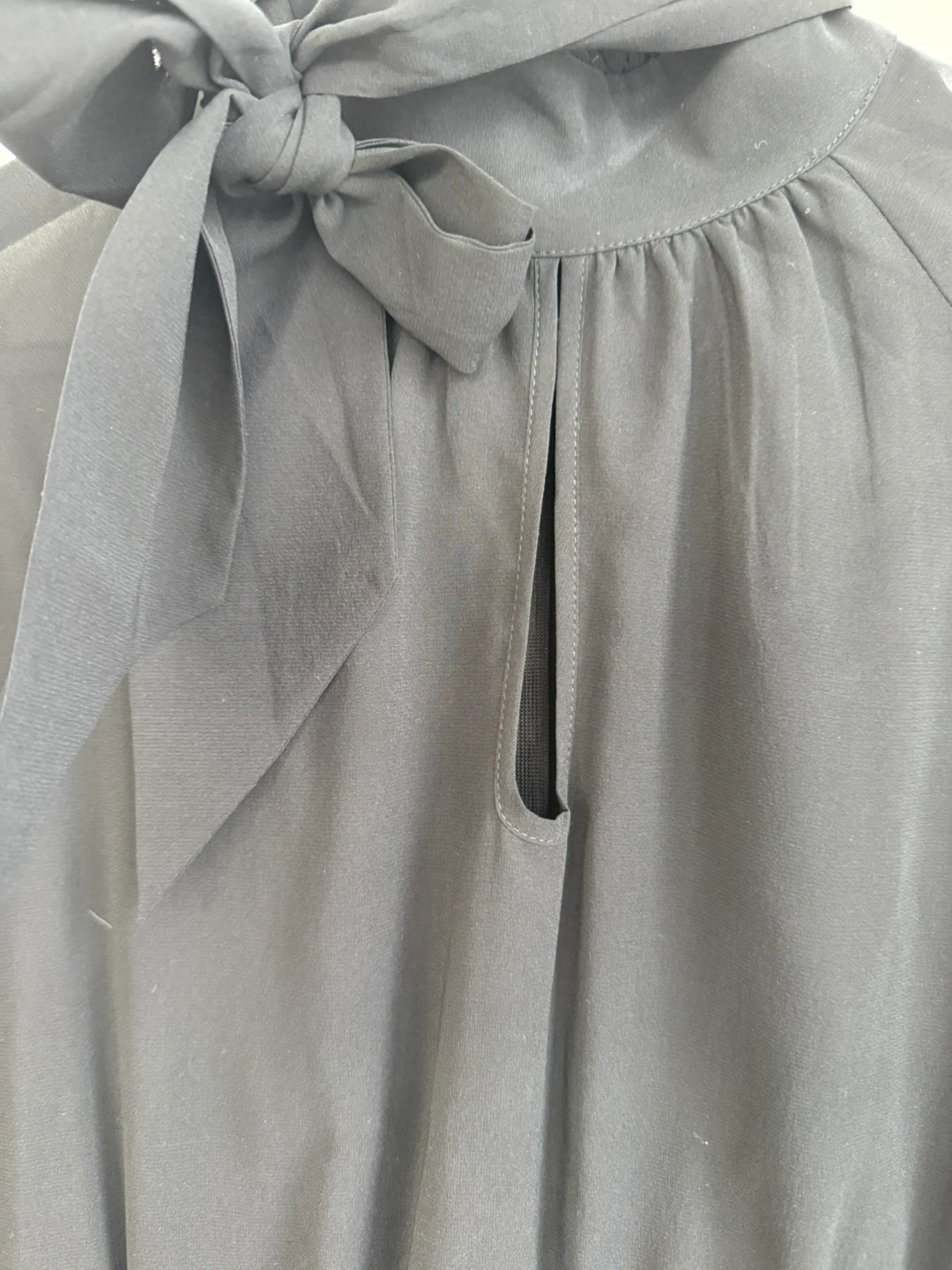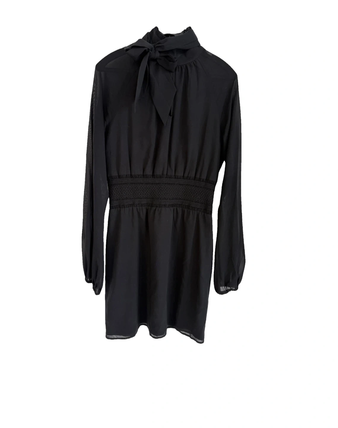 100A cute black dress featuring a bow at the neck! It has long sleeves and a fitted waist. Perfect for a night out or a special occasion