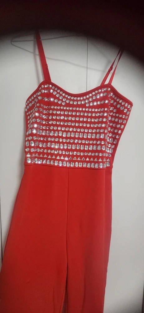 This red jumpsuit features a sparkly embellished top and is perfect for a night out or special occasion! It's in great condition and ready for a new home