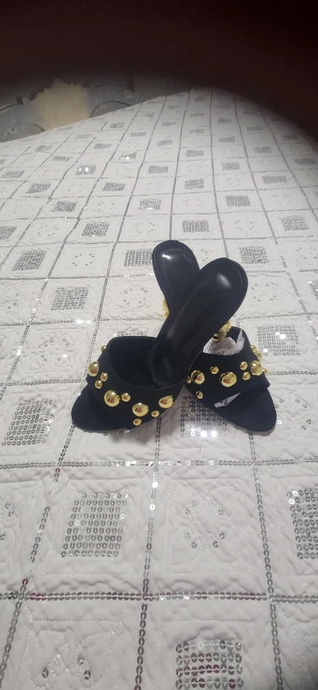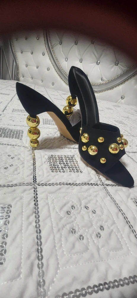 Selling a pair of stylish black heels in size 39. They feature unique gold sphere accents on the heel and upper. Perfect for a night out!