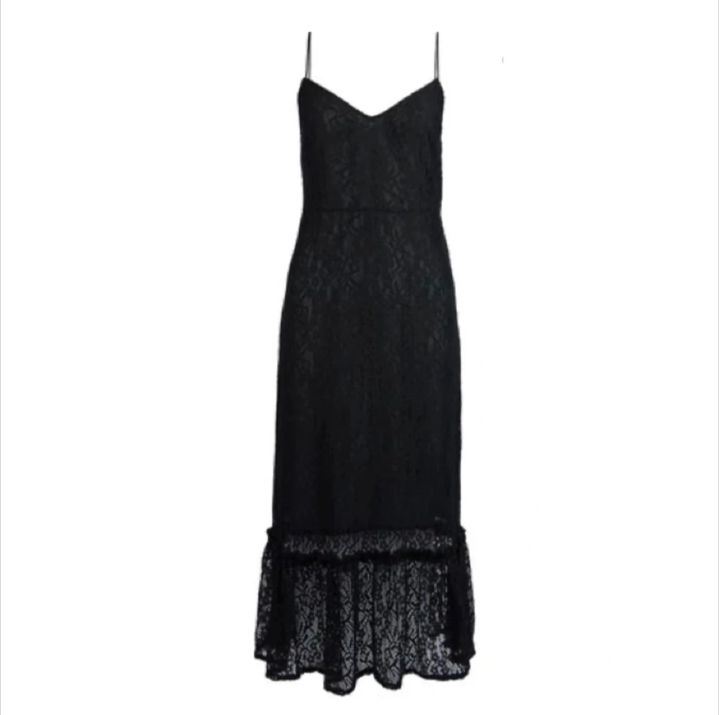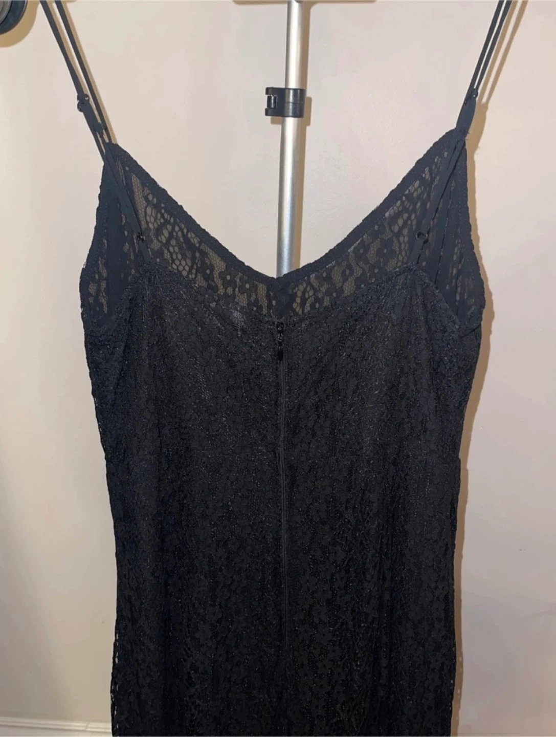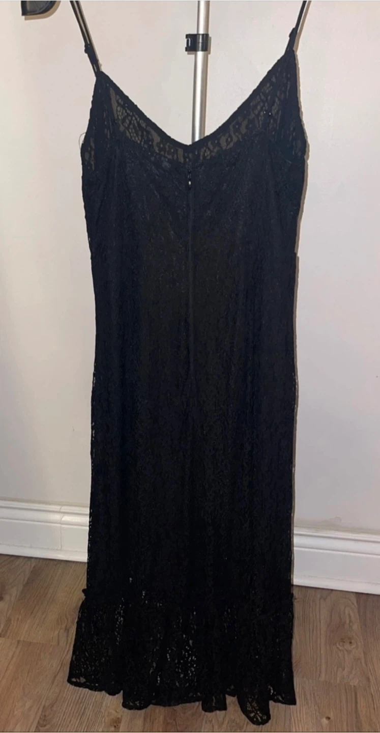 Chic black floral lace dress with spaghetti straps, back zipper. Never worn, size EU 42, US 10. Tight fitted, more like size medium. Size guide is in the last pic. No care tag. Features delicate lace overlay. Perfect for elegant occasions.