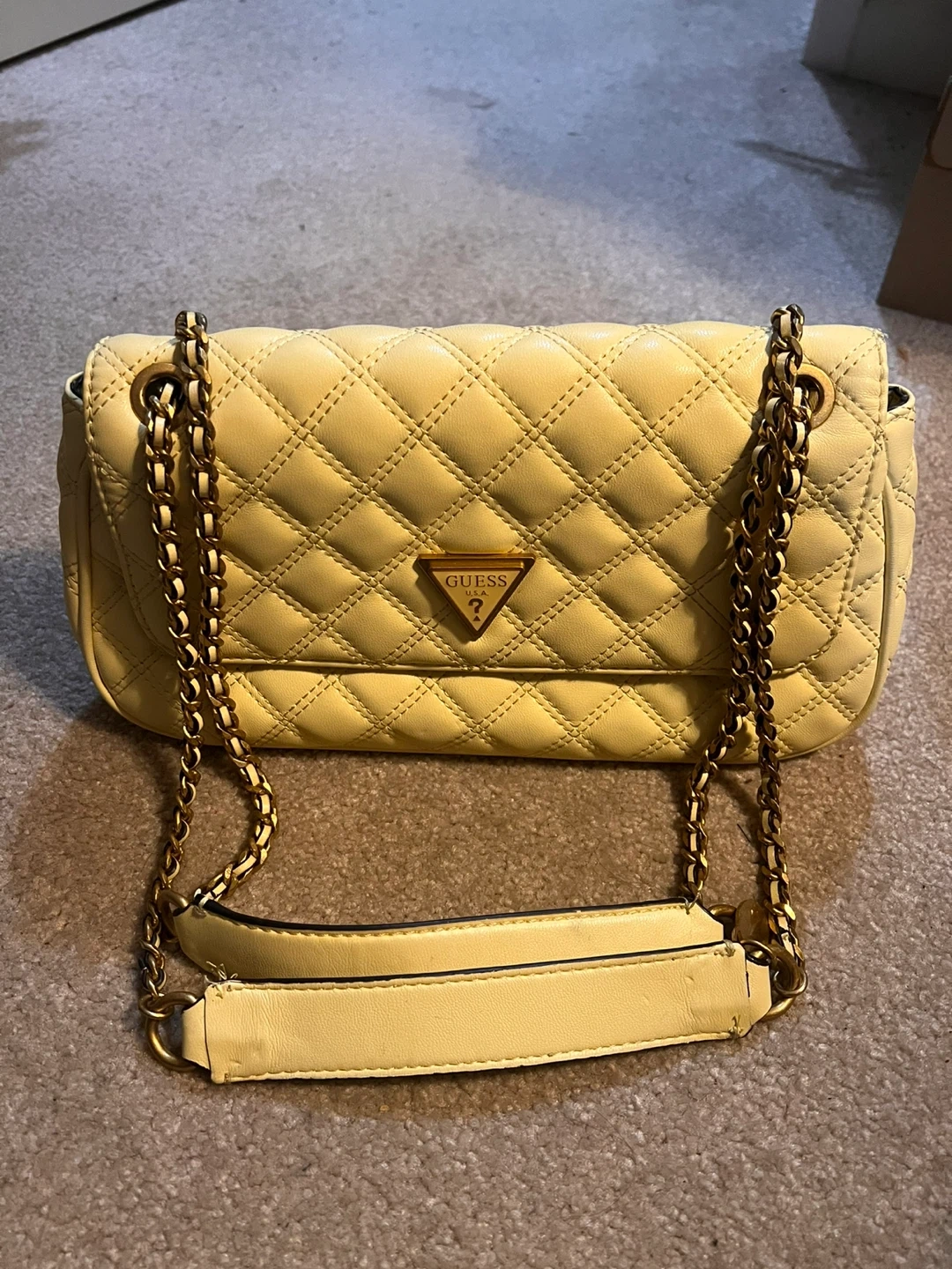 Selling a cute Guess shoulder bag! It features a quilted design and gold chain detailing. The colour is a lovely soft yellow. There are some signs of wear on the strap, as shown in the photos.