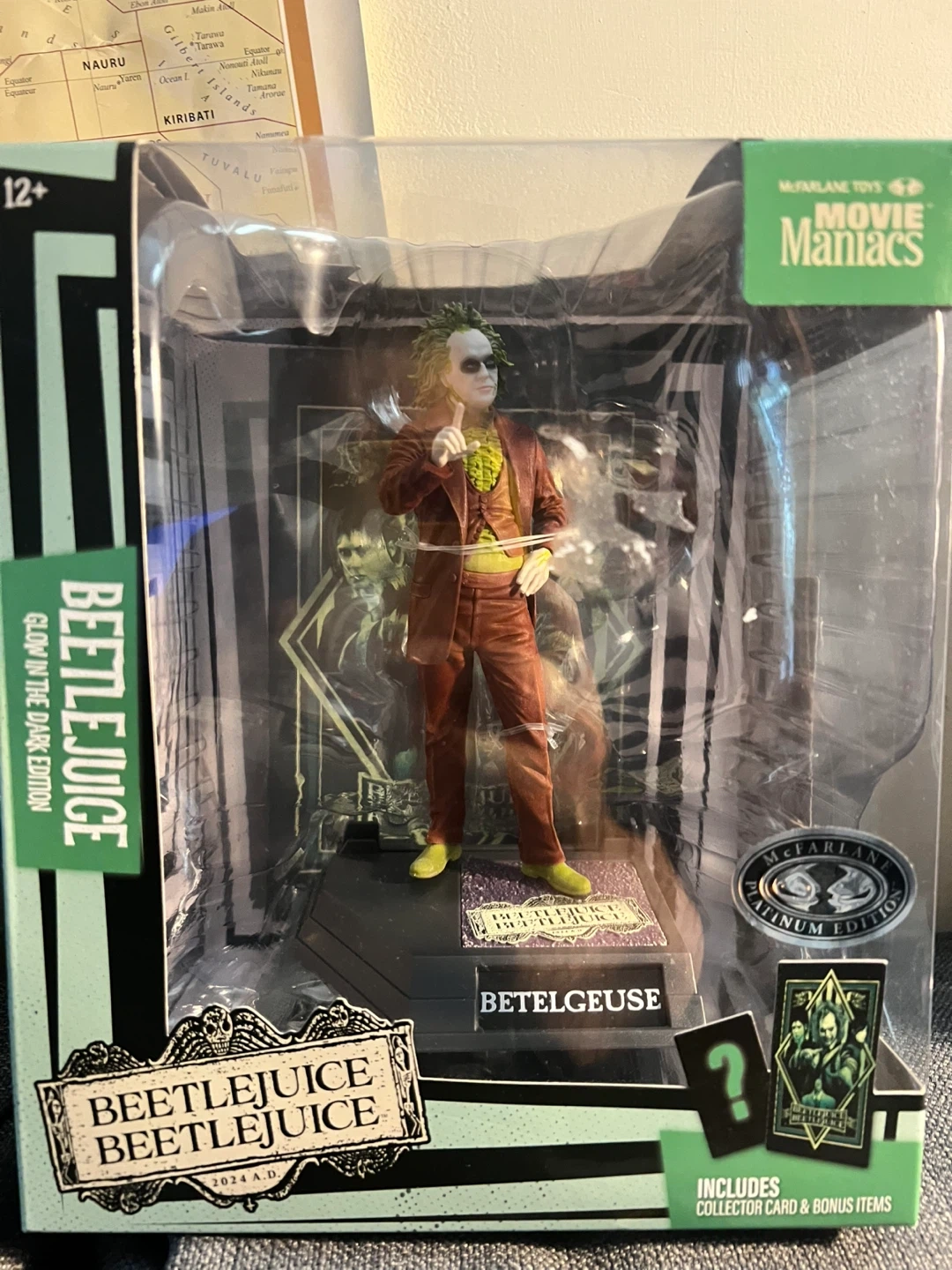10Selling a McFarlane Toys Movie Maniacs Beetlejuice (Betelgeuse) figure. It's a glow in the dark edition and includes a collector card and bonus items. A great addition for any collector!