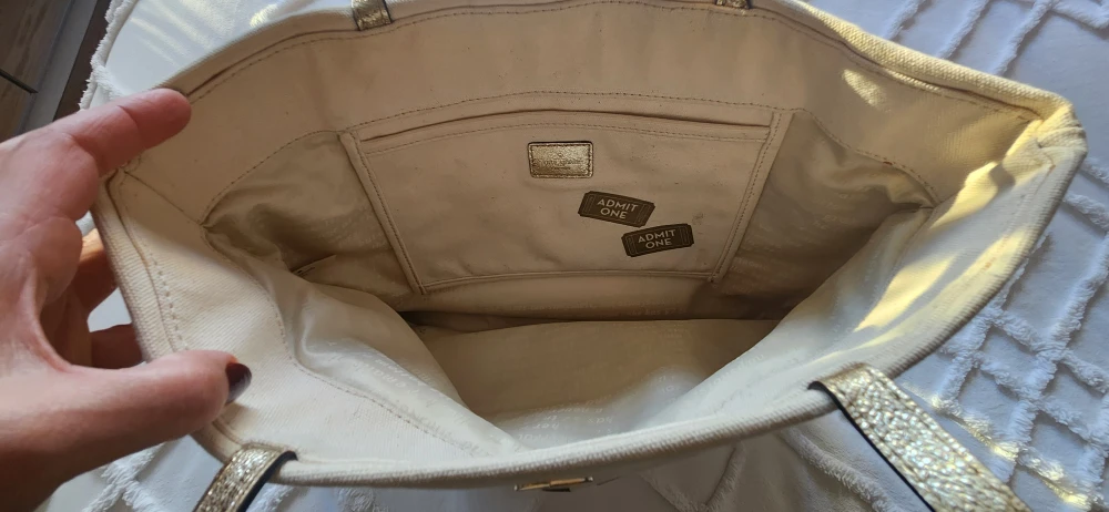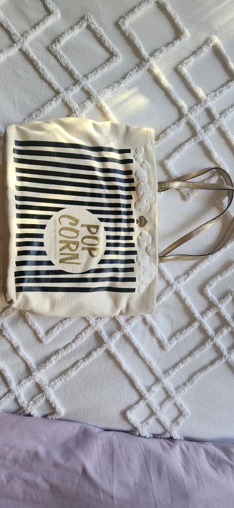This is a Kate Spade tote bag with a fun popcorn design! It's perfect for carrying your everyday essentials. The bag features a black and white striped pattern with a "Pop Corn" graphic on the front. The handles are a shiny gold colour. Inside, there's a handy pocket for keeping things organized