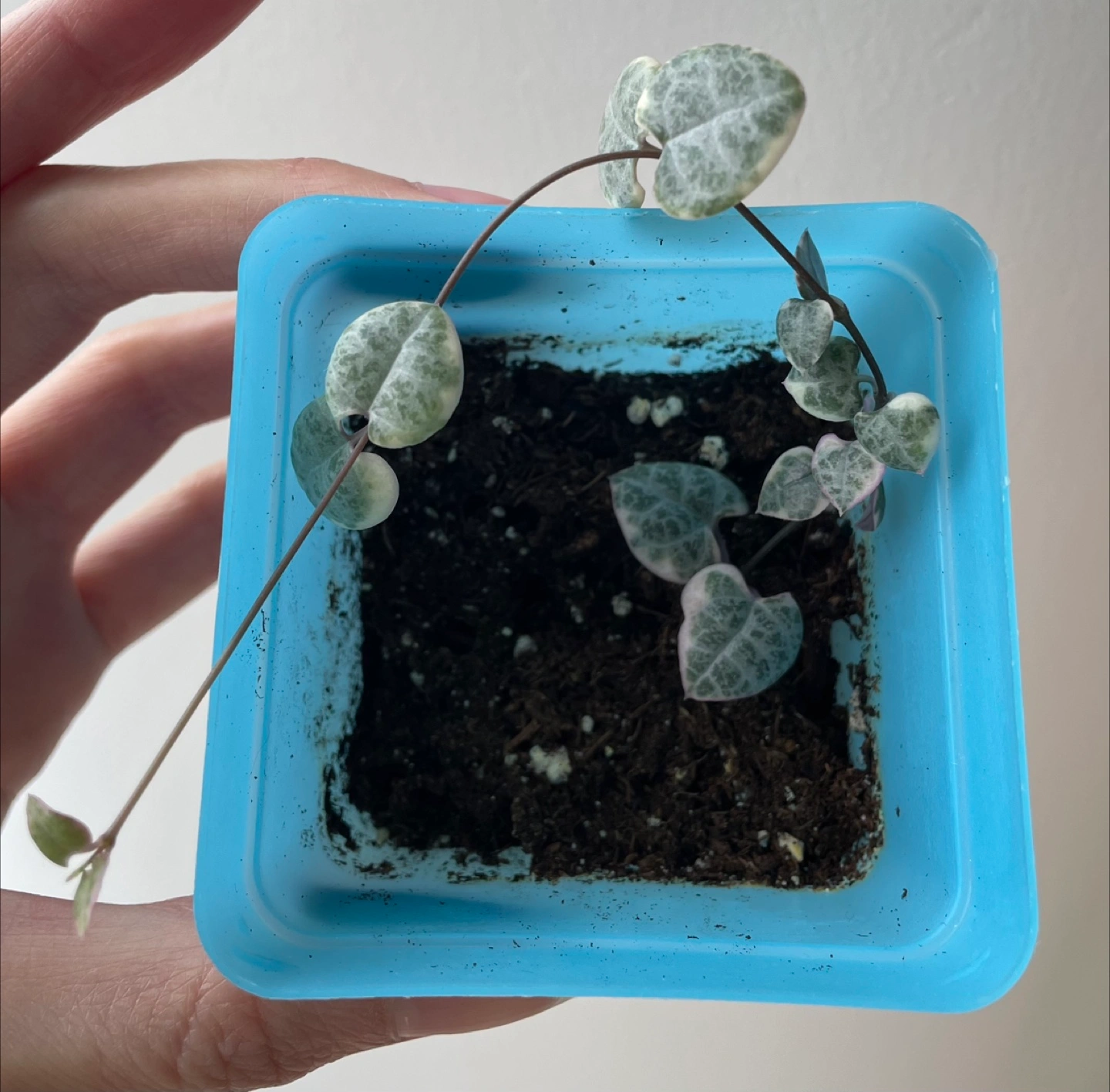 Here's a cute little variegated String of Hearts plant in a bright blue pot! This trailing succulent is easy to care for and adds a touch of greenery to any space. It’s rooted and growing