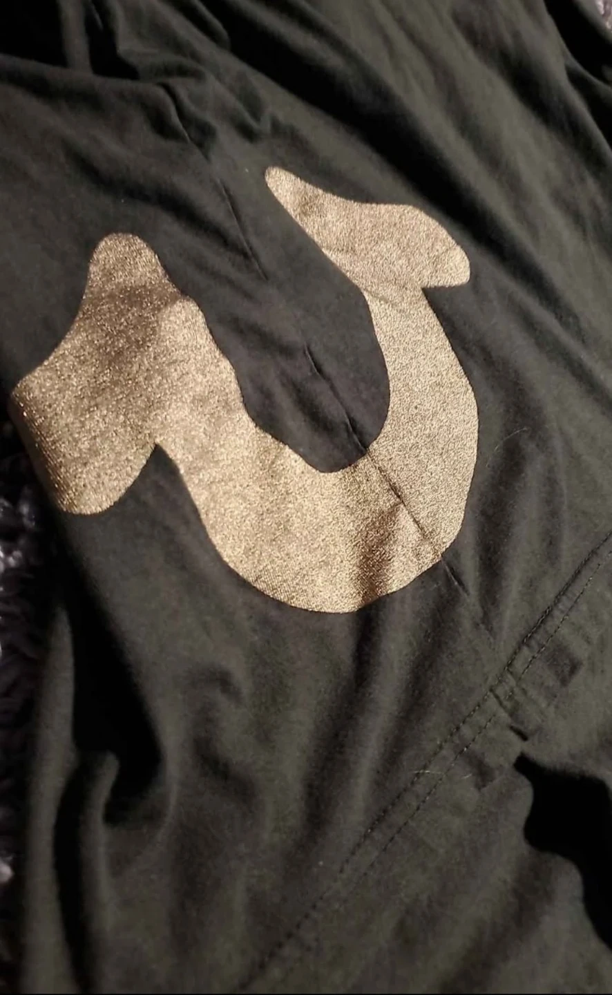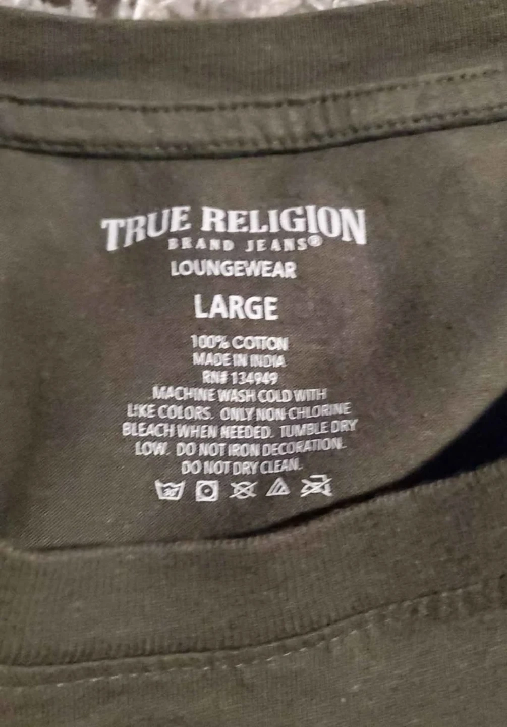 True Religion loungewear t-shirt in size large. It's made of 100% cotton and machine washable. The shirt features the True Religion logo on the back and a large graphic on the side