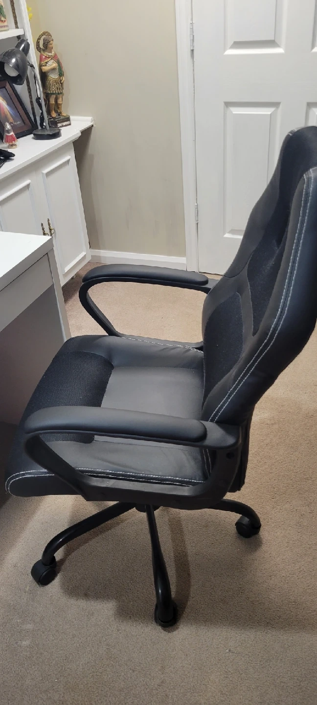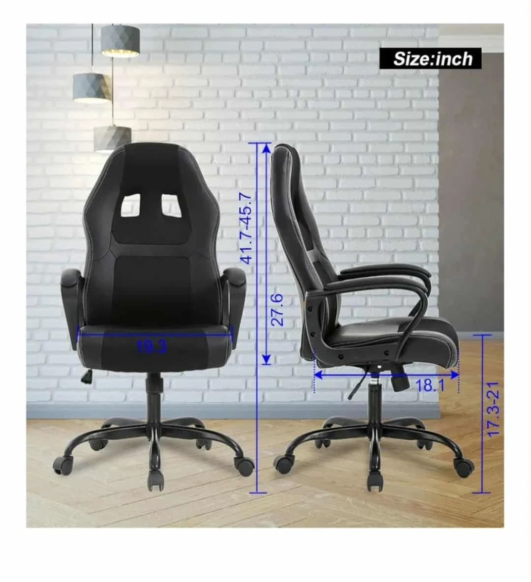 Selling a black gaming chair, perfect for your setup! The chair has a sleek design with a sporty look. The dimensions are approximately 41.7-45.7 inches in height, 18.3 inches in width, and 17.3-21 inches in seat depth. It's in great condition and ready for a new home