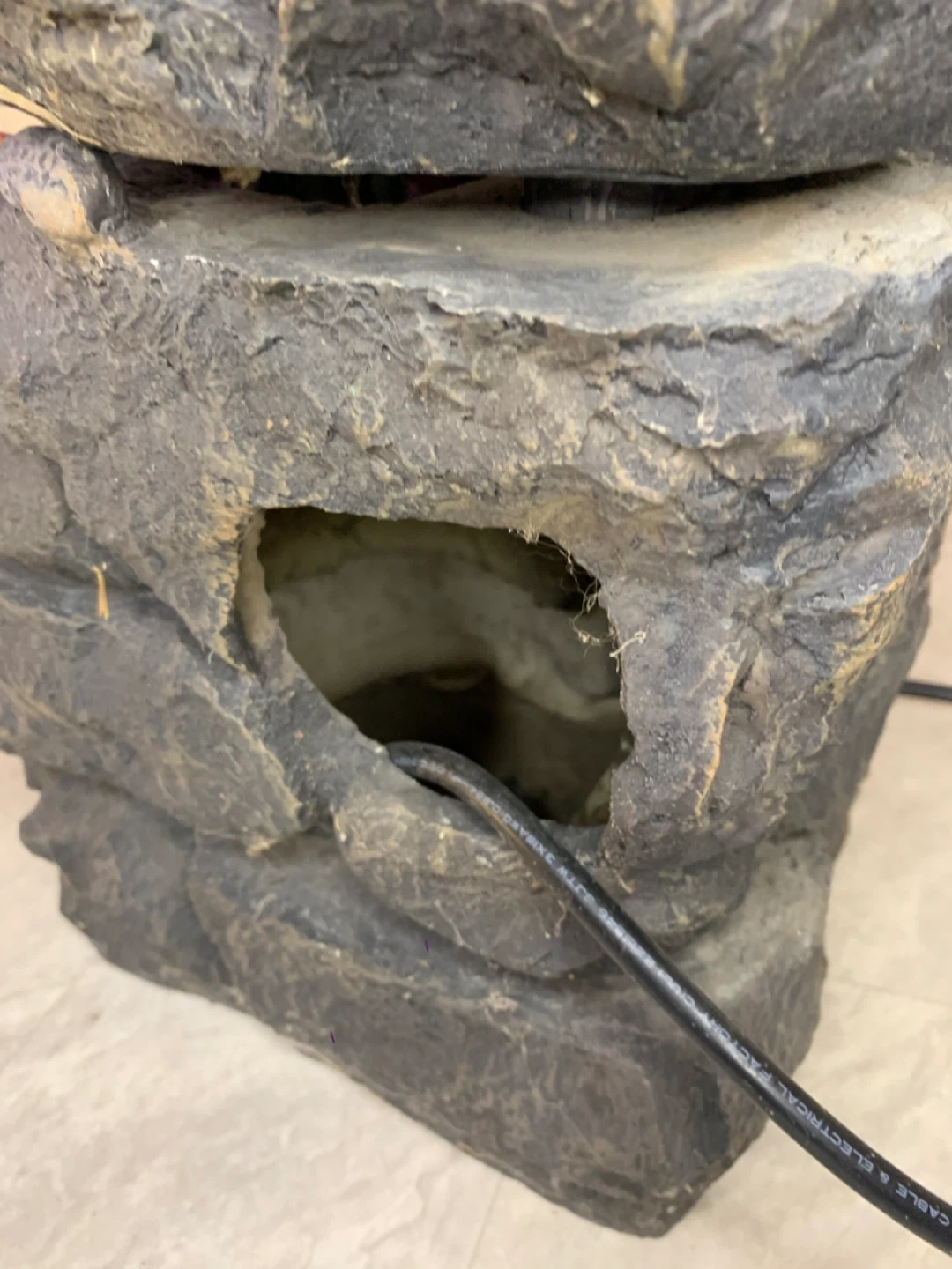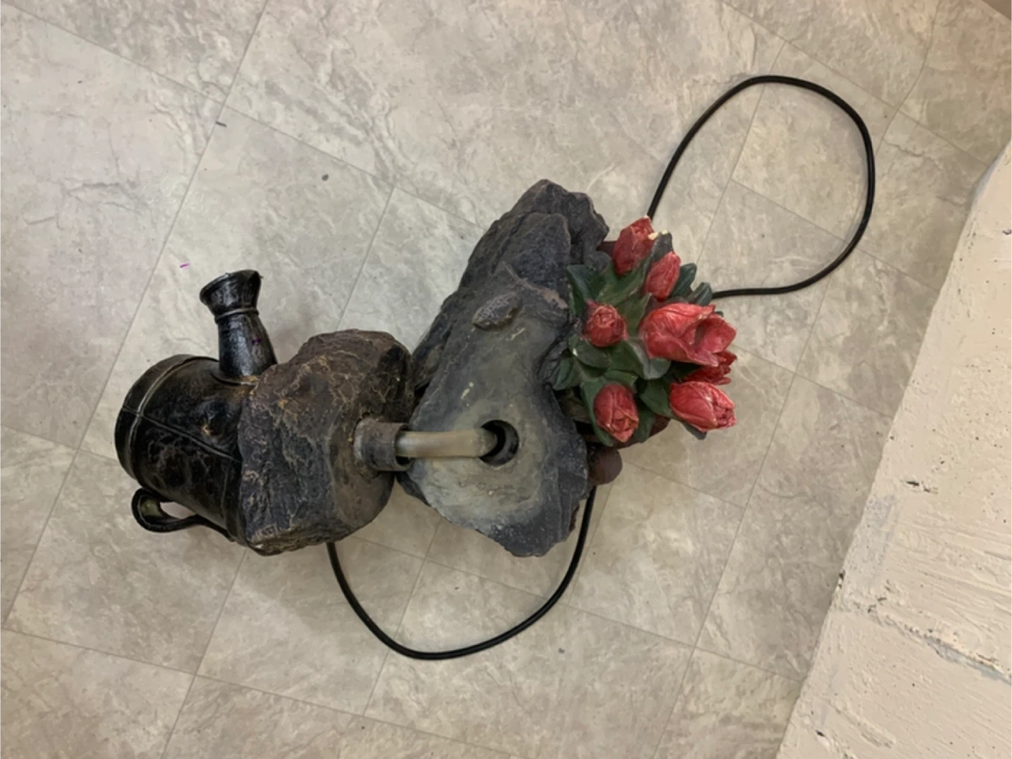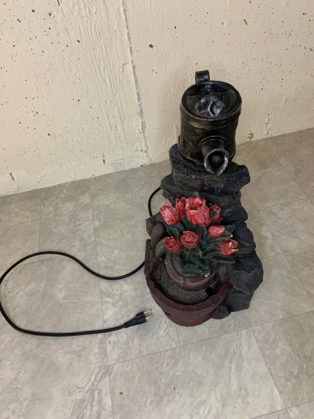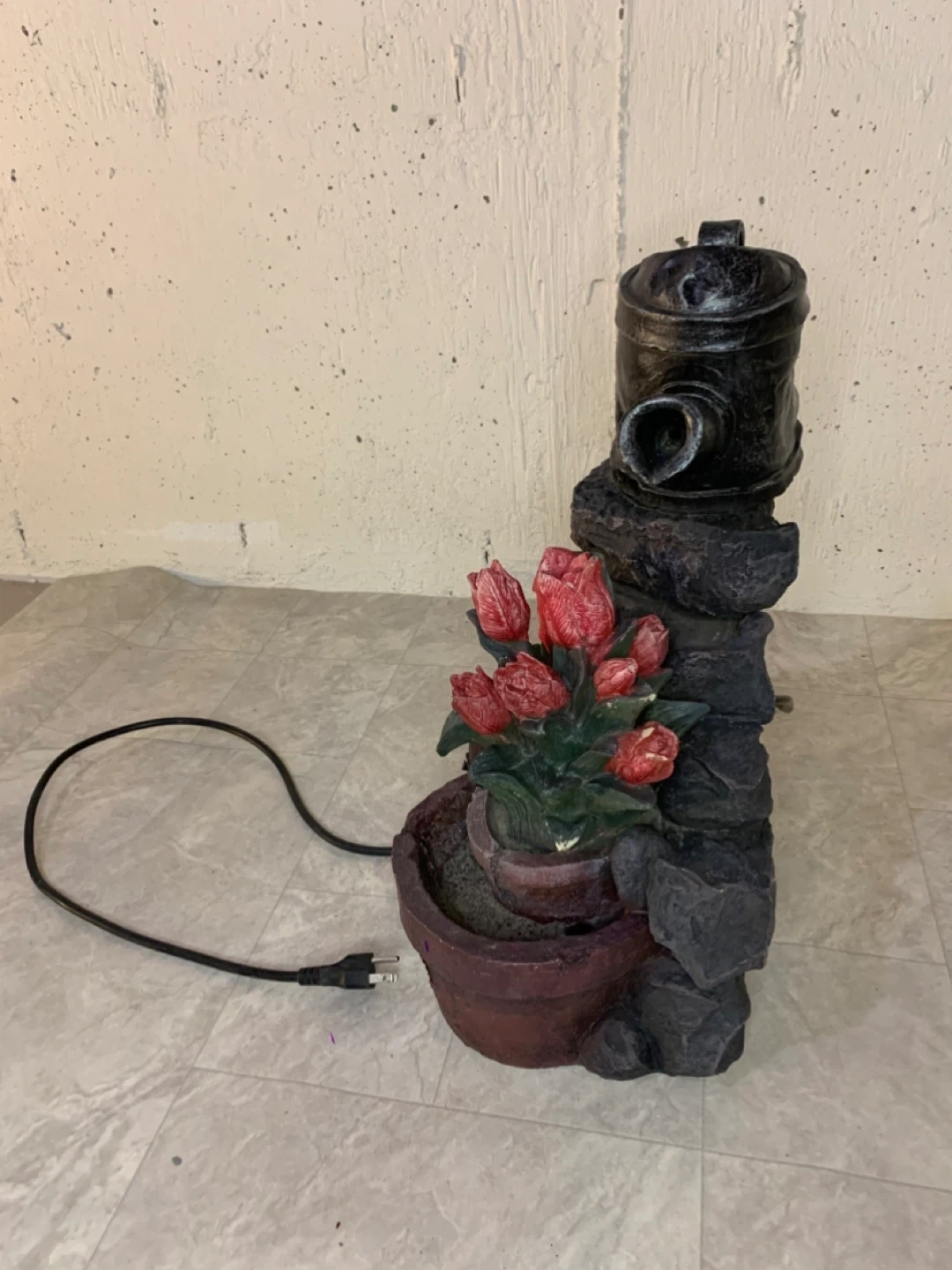 This fountain features a watering can design on top of a rocky base with flowers. It's a unique piece that could add a nice touch to any room or garden