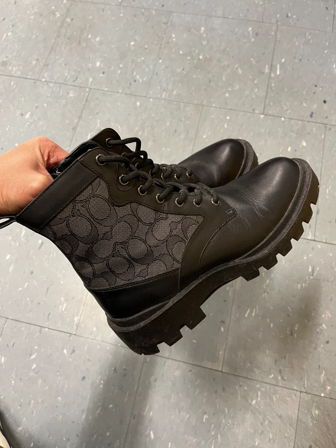 26Selling a pair of Coach black leather combat boots! They feature a stylish design with the Coach logo pattern on the sides. These boots are perfect for adding a bit of edge to any outfit.