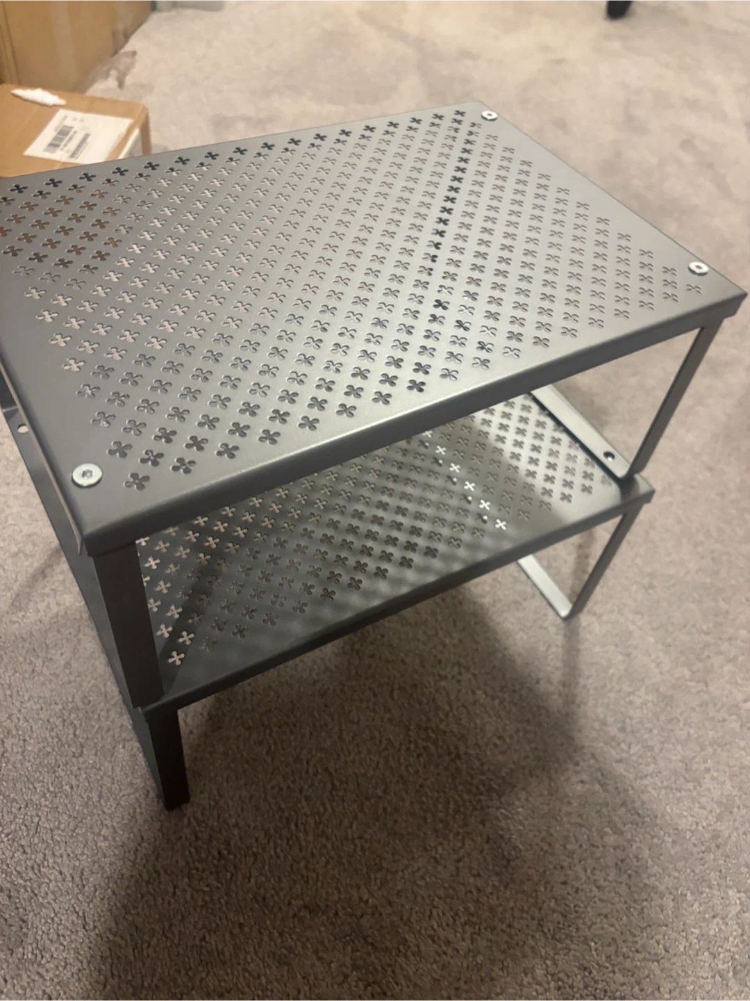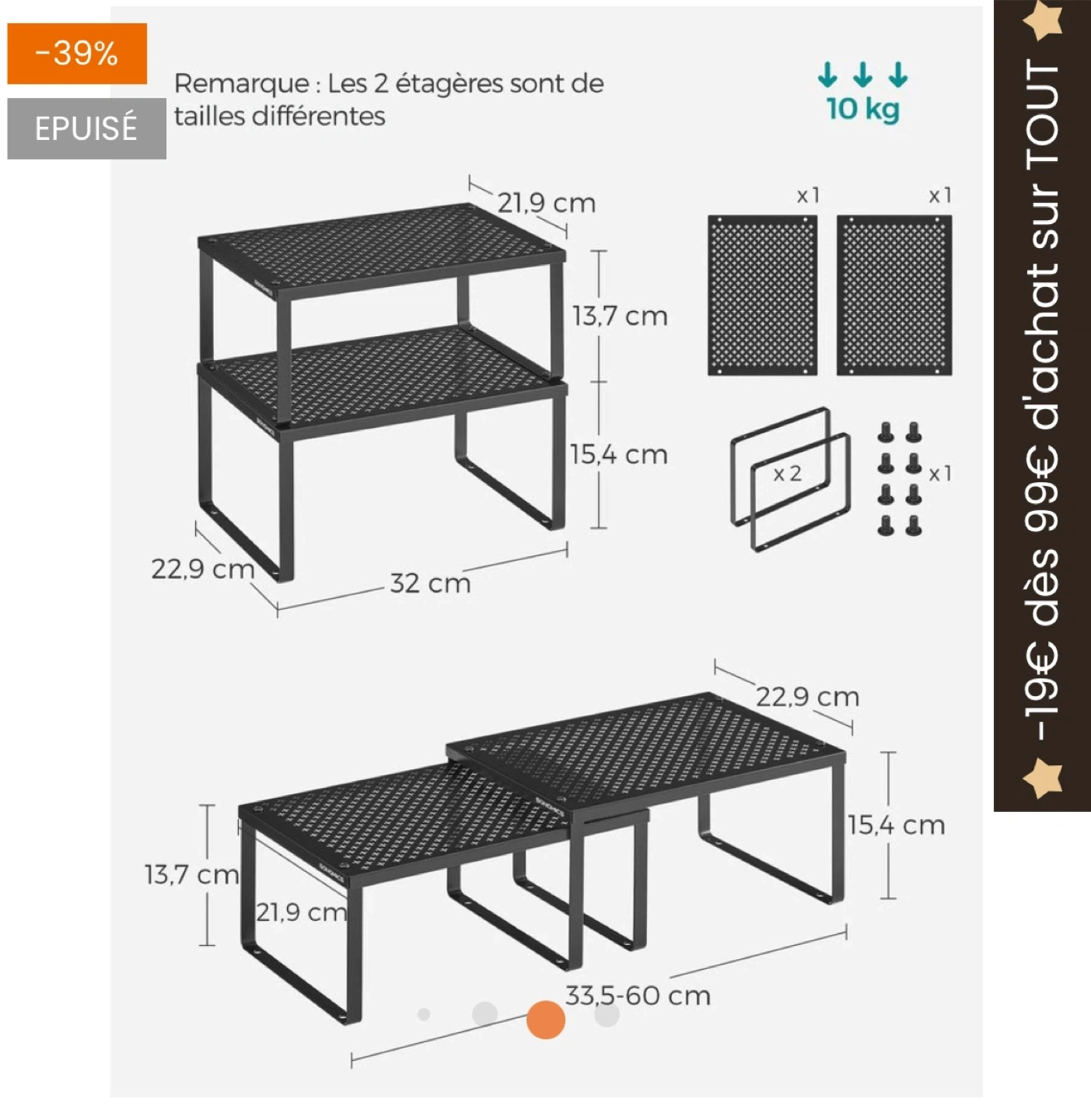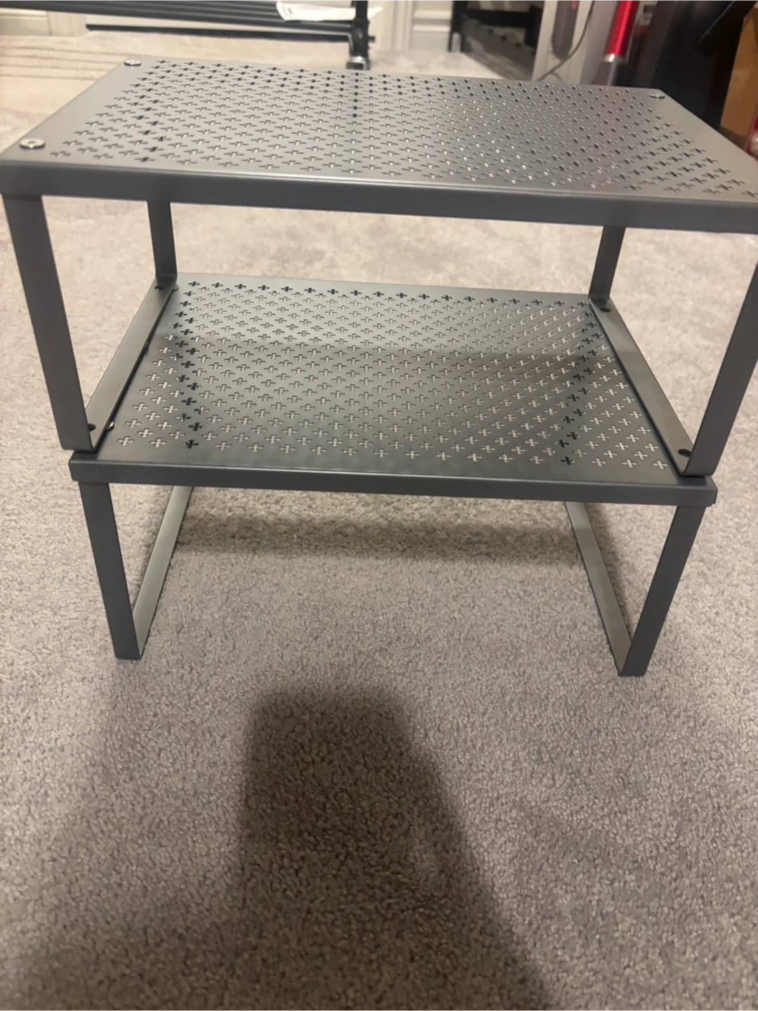 Selling a handy adjustable metal shelf organizer! Perfect for adding some extra storage space in your kitchen, bathroom, or closet. The dimensions are roughly 22cm x 32cm, and it can extend from 33.5cm to 60cm. It's for a new home