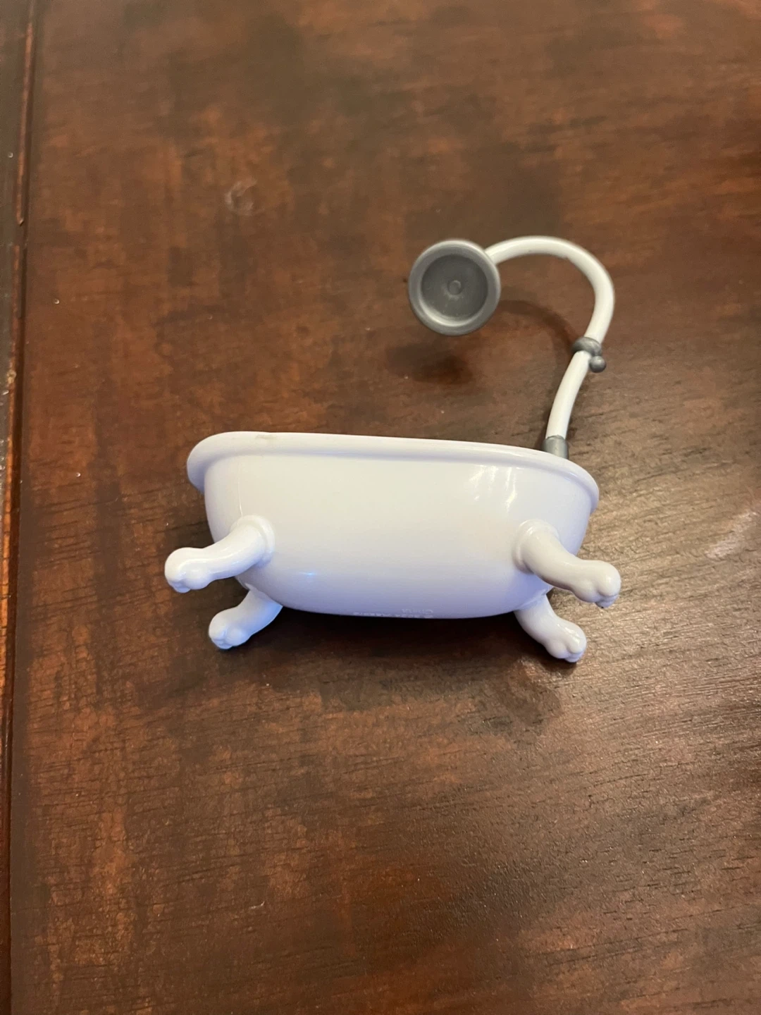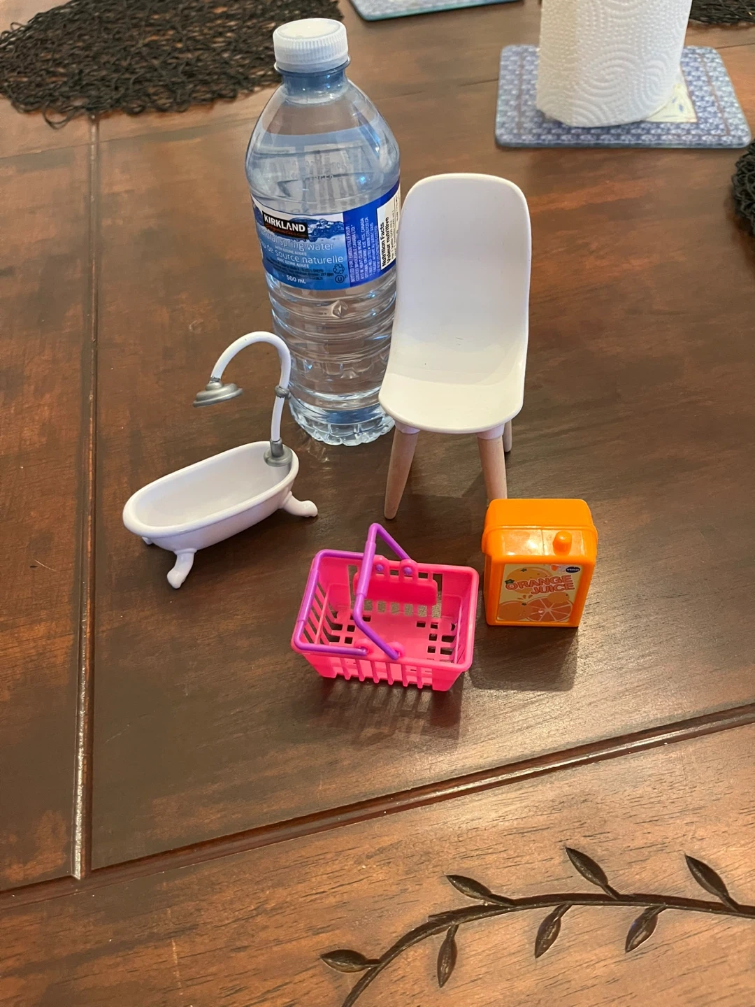 30Selling a cute dollhouse furniture set! Includes a white chair, bathtub with shower, and a shopping basket. Perfect for a dollhouse or imaginative play