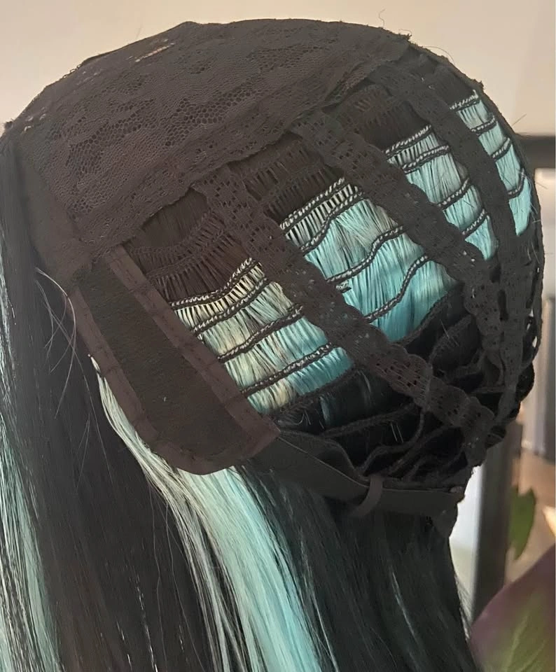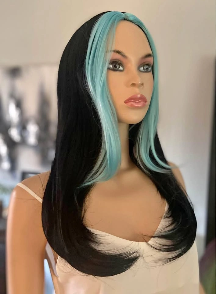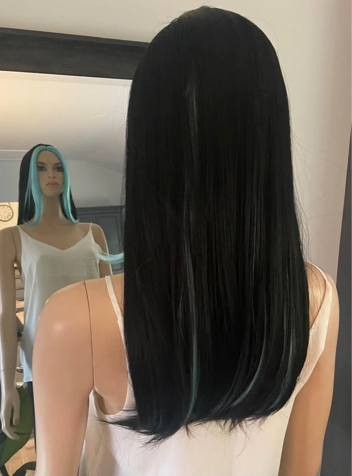 99Brand new with tags and from a smk-free home Long, straight, sleek, solid black with straight parting and long turquoise bangs/layers at front and lowlights throughout Stretch lace cap is breathable and comfortable Inner elasticated adjustable straps One size fits most Great for daily wear or Vampire, Morticia Addams, or Witch costume Pick up north end St Catharines