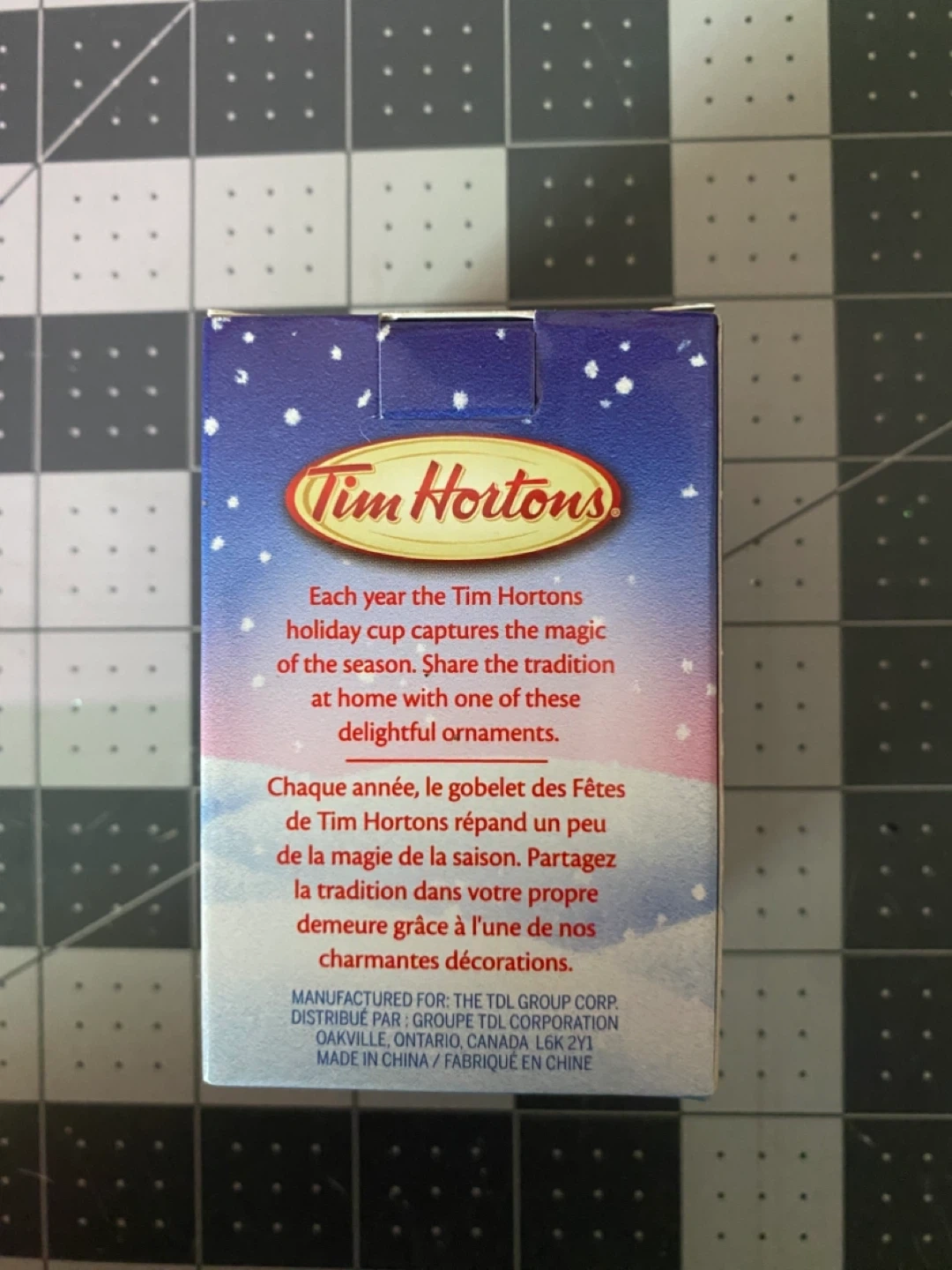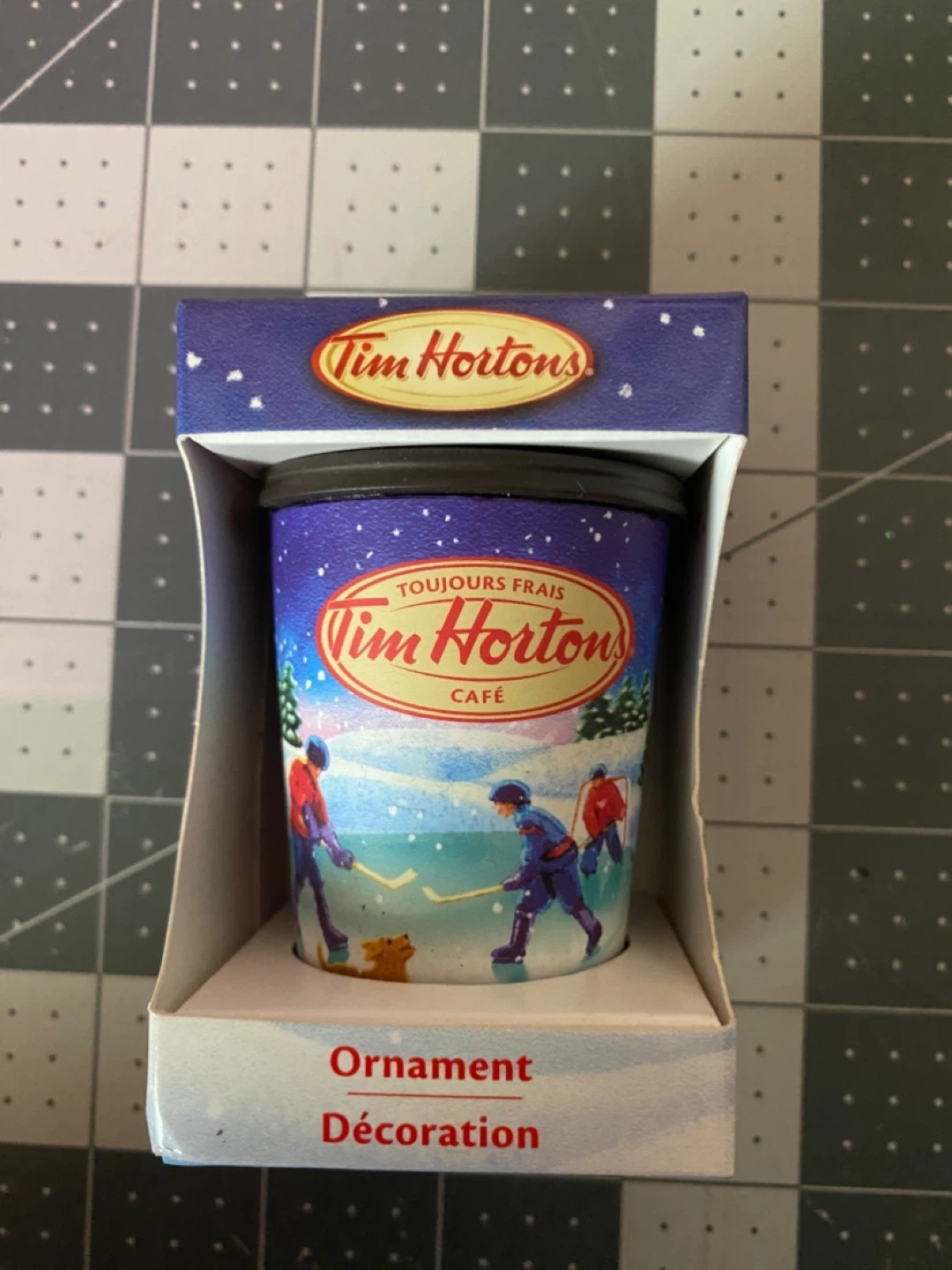 Selling a Tim Hortons holiday cup ornament! It's a cute little decoration featuring a winter scene with hockey players. Perfect for adding a touch of Canadian charm to your holiday decor