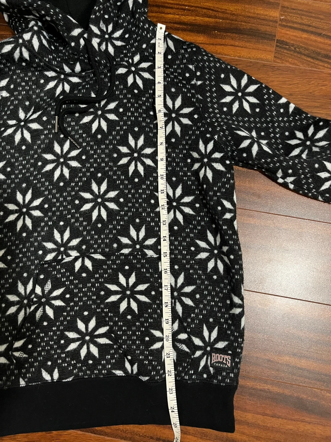 Cozy Roots hoodie, women’s size small. Black and white snowflake print with ‘Canada’ embroidered on hood. Features a fleecy interior, knitted texture exterior, kangaroo pocket, ribbed cuffs and waistband, and classic Roots logo patch.