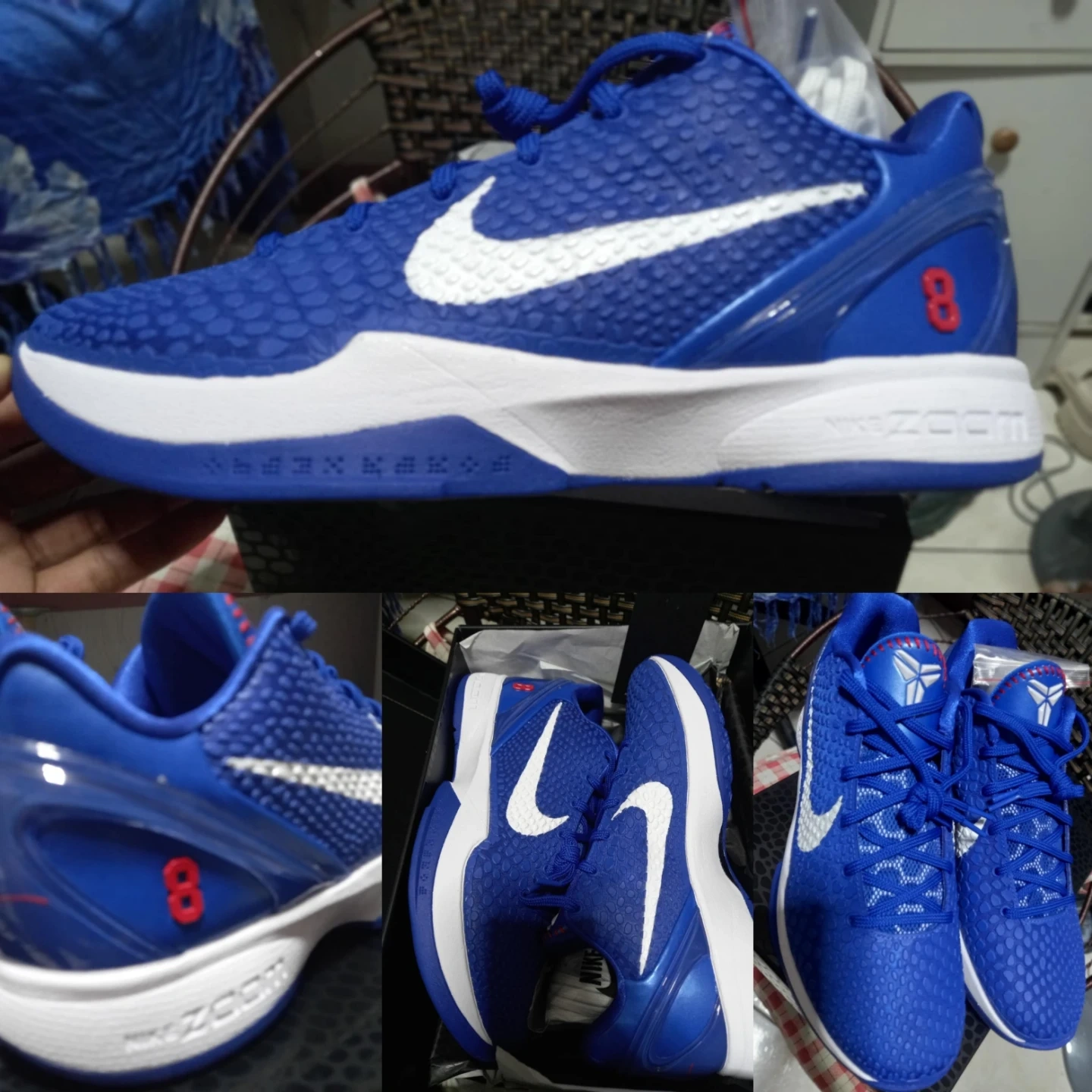 Selling a pair of Nike Kobe 6 Protro shoes in blue! They are in excellent condition and come with the original box. The shoes feature the iconic Nike swoosh in white and Kobe's number 8 on the heel. Size is 10 US.