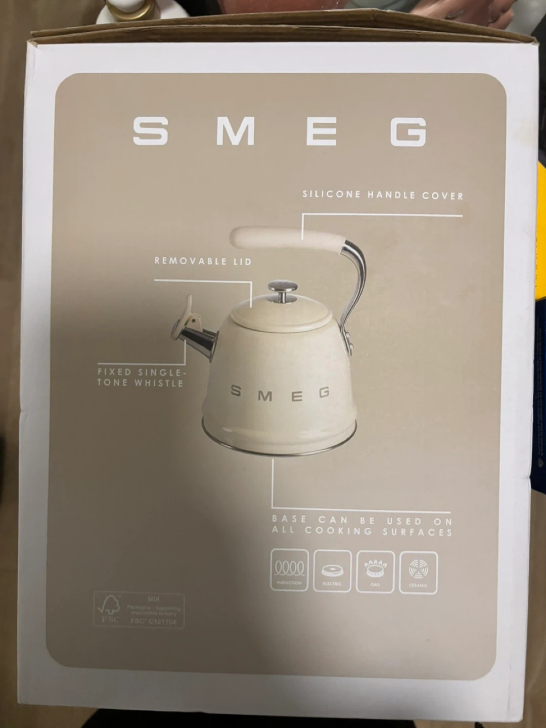 224Brand new!!!!! Colour is Cerise Selling a Smeg aWhistling Kettle, with a 2.3 L / 2.5-Qt capacity. It comes with a silicone handle cover and a removable lid. The base can be used on all cooking surfaces. The box is included!