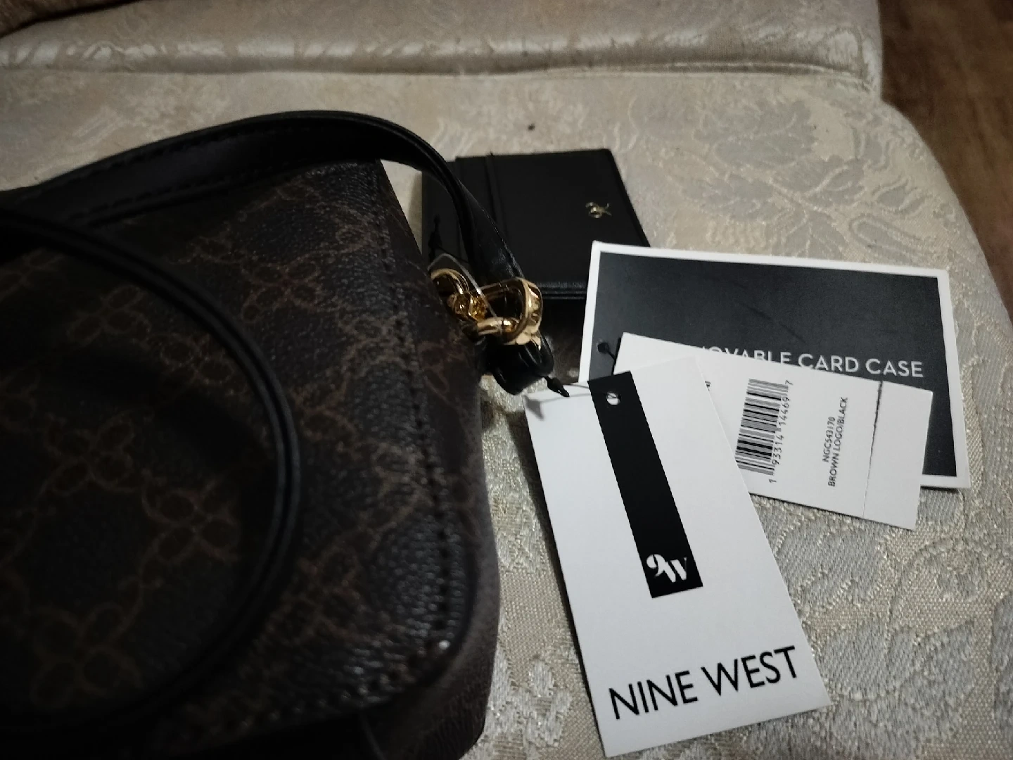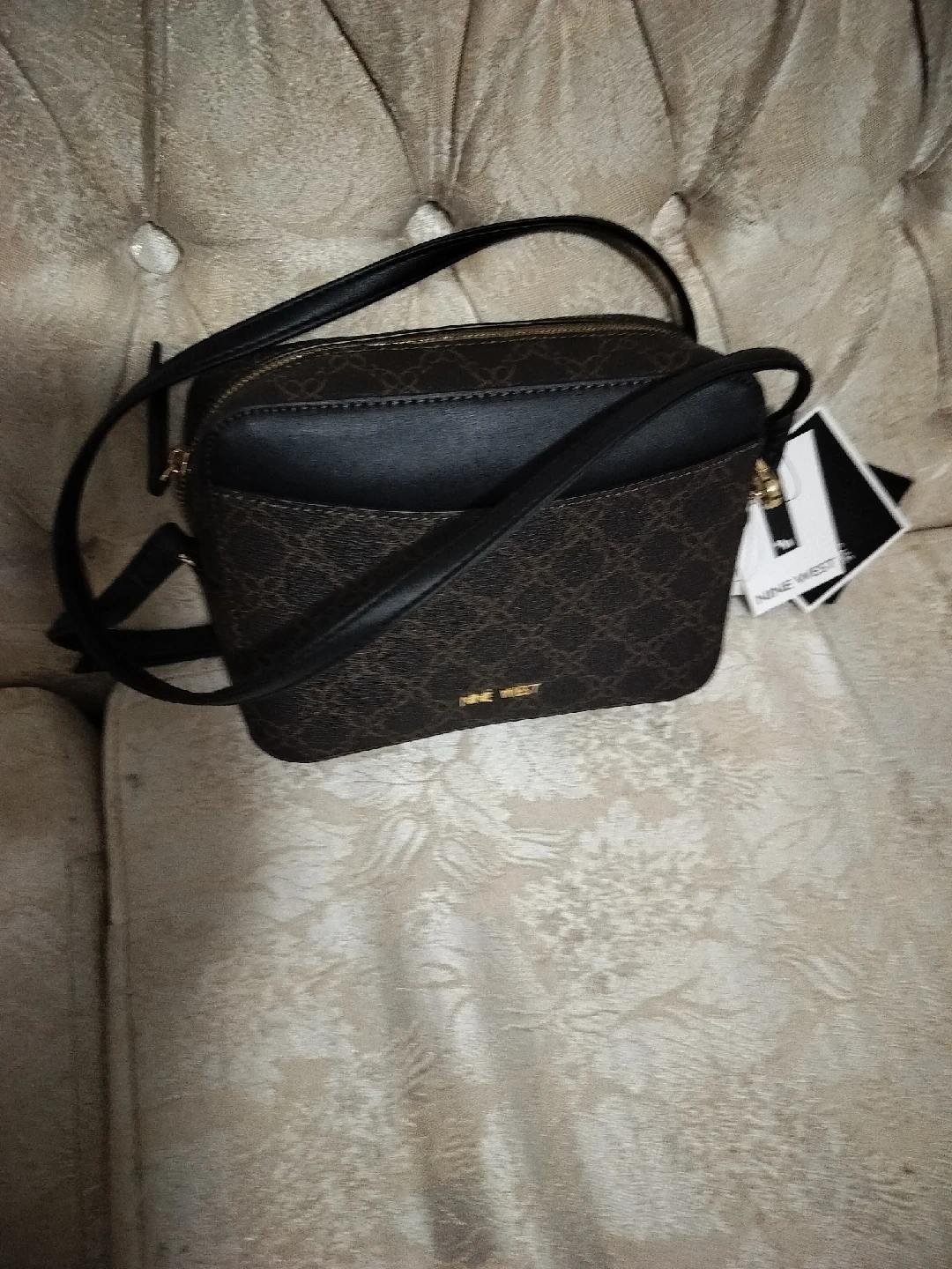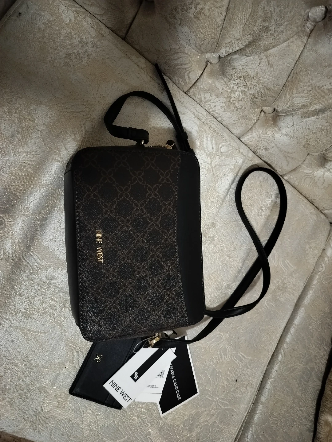 New Nine West crossbody bag in good condition. Features a brown and black design with a gold-tone zipper. Comes with an attachable card case.