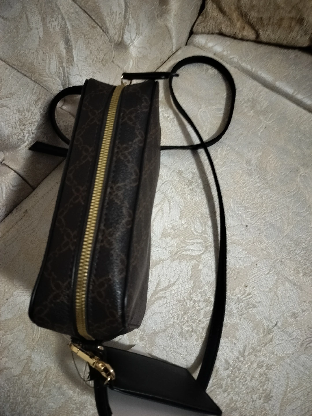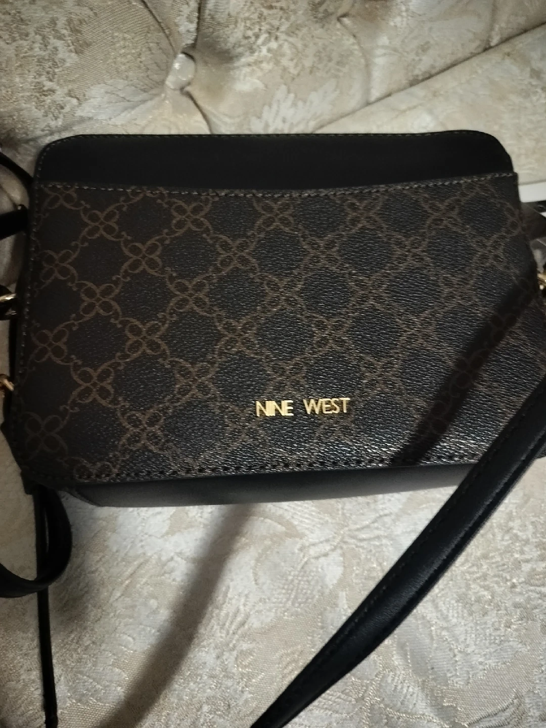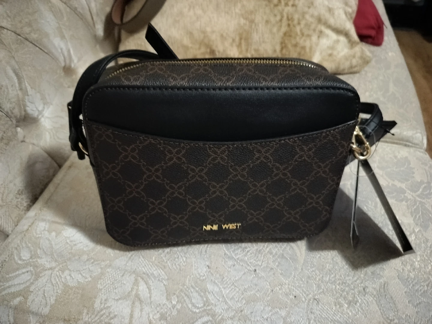 New Nine West crossbody bag in good condition. Features a brown and black design with a gold-tone zipper. Comes with an attachable card case.