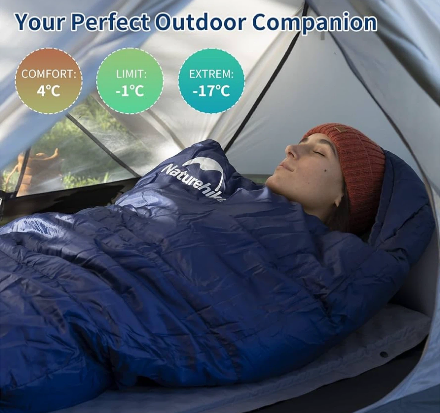 Selling a Naturehike MJ300 sleeping bag in blue! It's perfect for camping, hiking, climbing, or even just using at home. It's designed to keep you comfortable with a comfort rating of 4°C, a limit of -1°C, and an extreme rating of -17°C. It's easy to carry, weighing only 1.1kg/2.42lbs. The sleeping bag measures about 205cm/80.7in in length and 75cm/29.5in in width. It also comes with a convenient carrying bag!