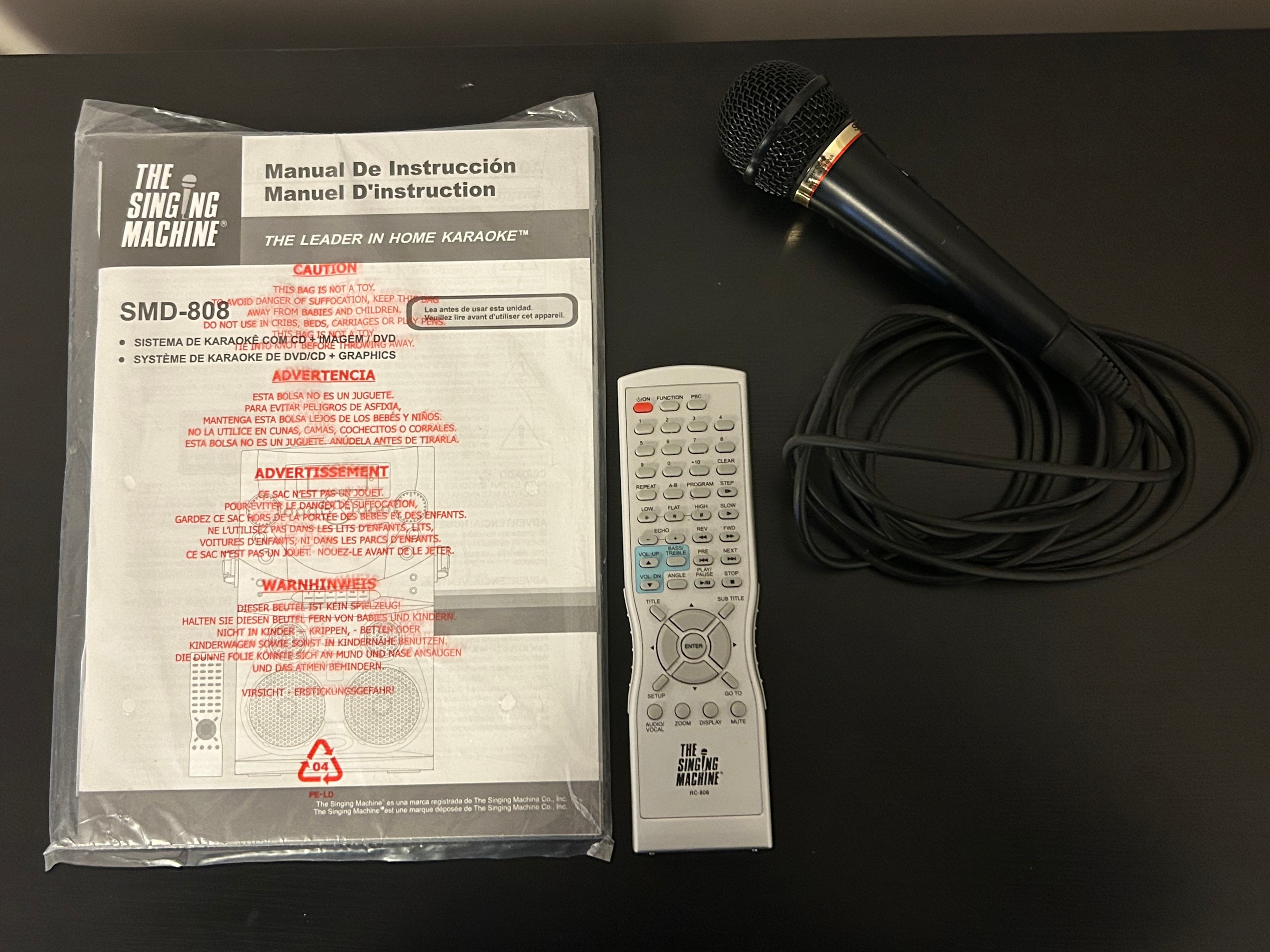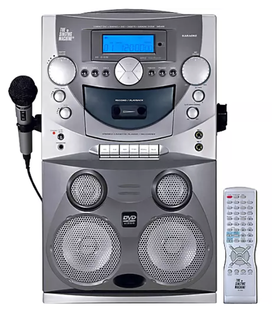 "The Singing Machine" SMD-808 DVD/CD Sony Karaoke System is a top-load CD+Graphics/DVD player that offers a lot of fun karaoke functions. It features CDR/CDRW/MP3/Kodak Picture CD/Windows Media playback; cassette deck; video output; audio aux input/aux output; LCD screen; two mic inputs with volume control, reverb, digital pitch fix, balance control, and tone control.