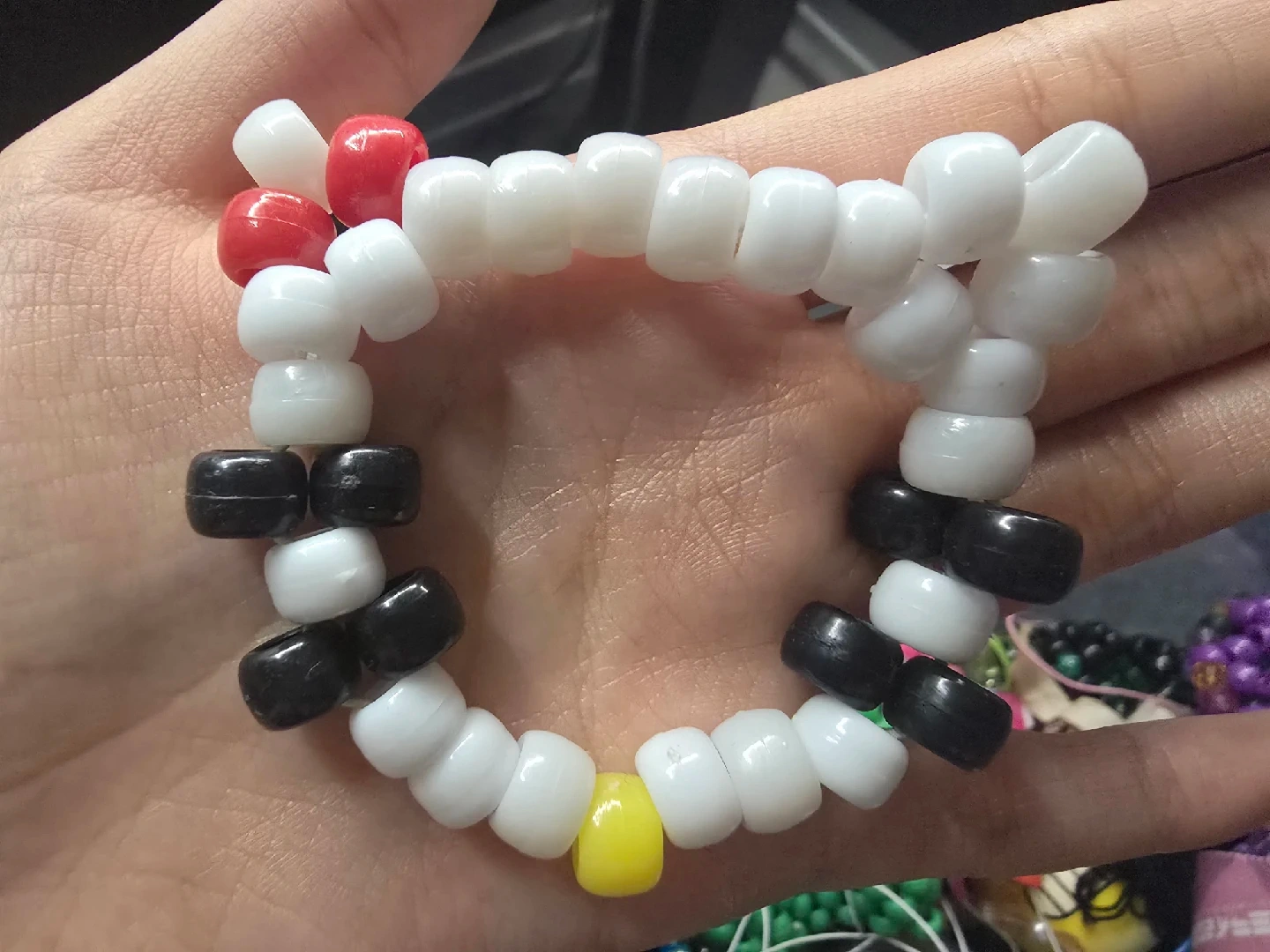 Handmade Hello Kitty themed kandi bracelet! It's made with pony beads in black, white, red, and yellow. Perfect for adding a bit of fun to any outfit