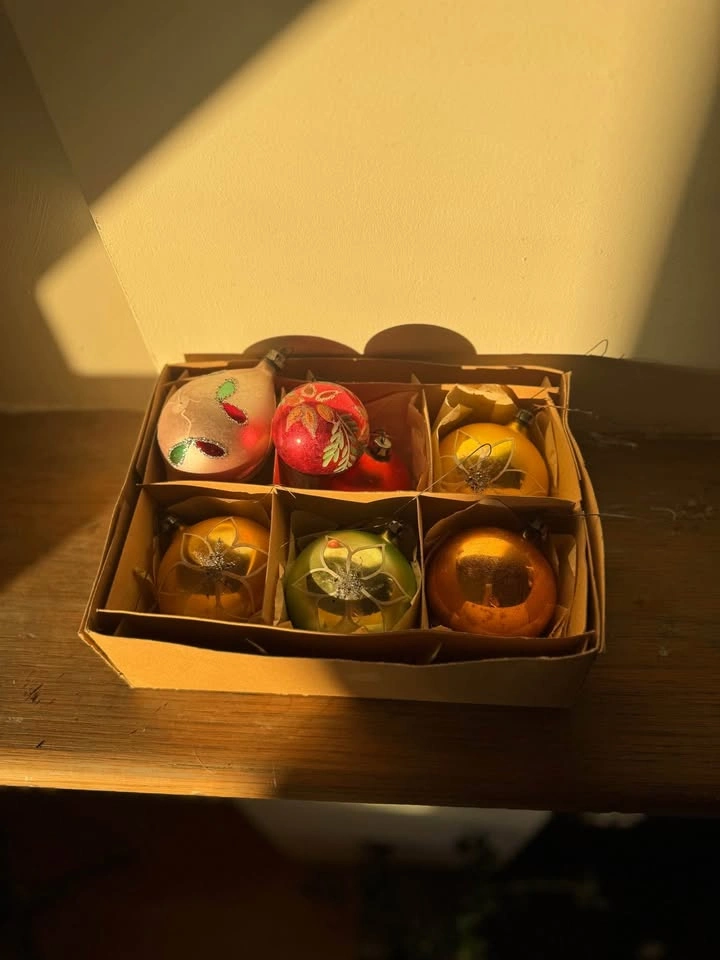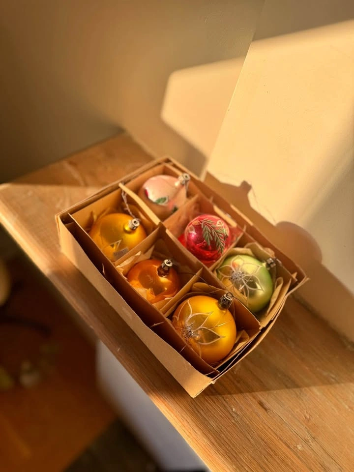 Add a touch of nostalgia to your holiday with this beautiful set of 7 vintage glass Christmas ornaments. Features classic shapes, bright colors (red, green, gold, blue, silver), and a lovely aged patina. Perfect for a retro or mid-century modern (MCM) Christmas tree!