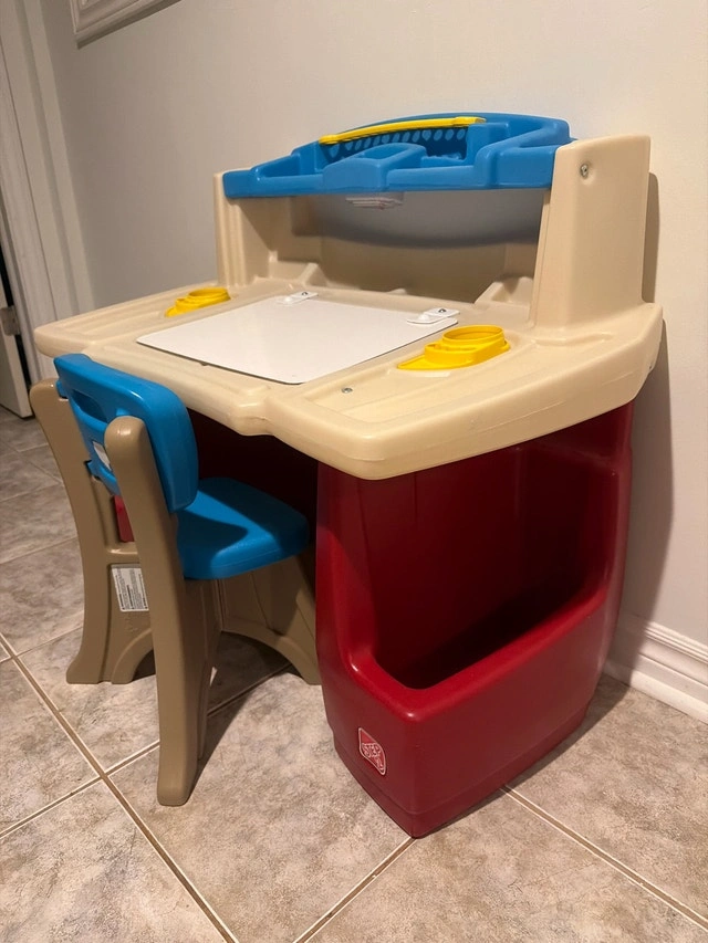 This kids’ art desk is a sturdy art studio with tons of storage and a desktop space to create a variety of masterpieces. Features a raised shelf and vertical side bins to hold art supplies, sketchbooks, paper, and other artist essentials. Little artists have plenty of room to spread out on the large desktop with molded-in grooves to keep writing and coloring utensils near. Pull up the matching chair, click on the overhead desk light, and get creative with paper and paints, or use the desktop whiteboard with dry-erase markers for quick sketches. The whiteboard also opens to another storage area underneath, so they’ll always have a spot to keep completed artwork! Condition: Used - Like new. Cash accepted: Yes.