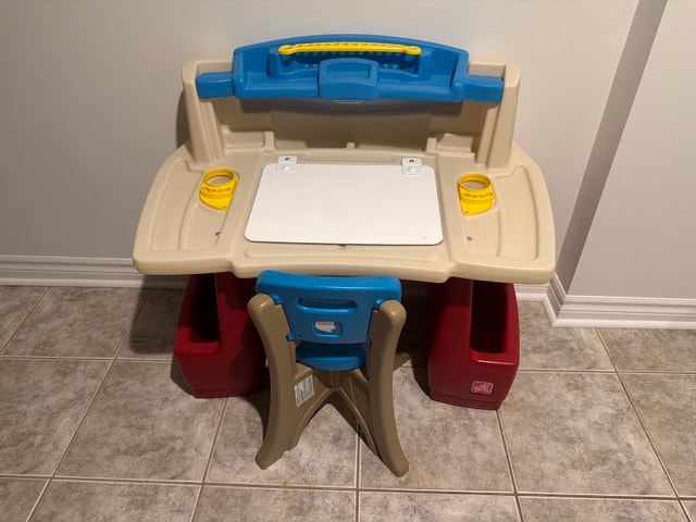 This kids’ art desk is a sturdy art studio with tons of storage and a desktop space to create a variety of masterpieces. Features a raised shelf and vertical side bins to hold art supplies, sketchbooks, paper, and other artist essentials. Little artists have plenty of room to spread out on the large desktop with molded-in grooves to keep writing and coloring utensils near. Pull up the matching chair, click on the overhead desk light, and get creative with paper and paints, or use the desktop whiteboard with dry-erase markers for quick sketches. The whiteboard also opens to another storage area underneath, so they’ll always have a spot to keep completed artwork! Condition: Used - Like new. Cash accepted: Yes.