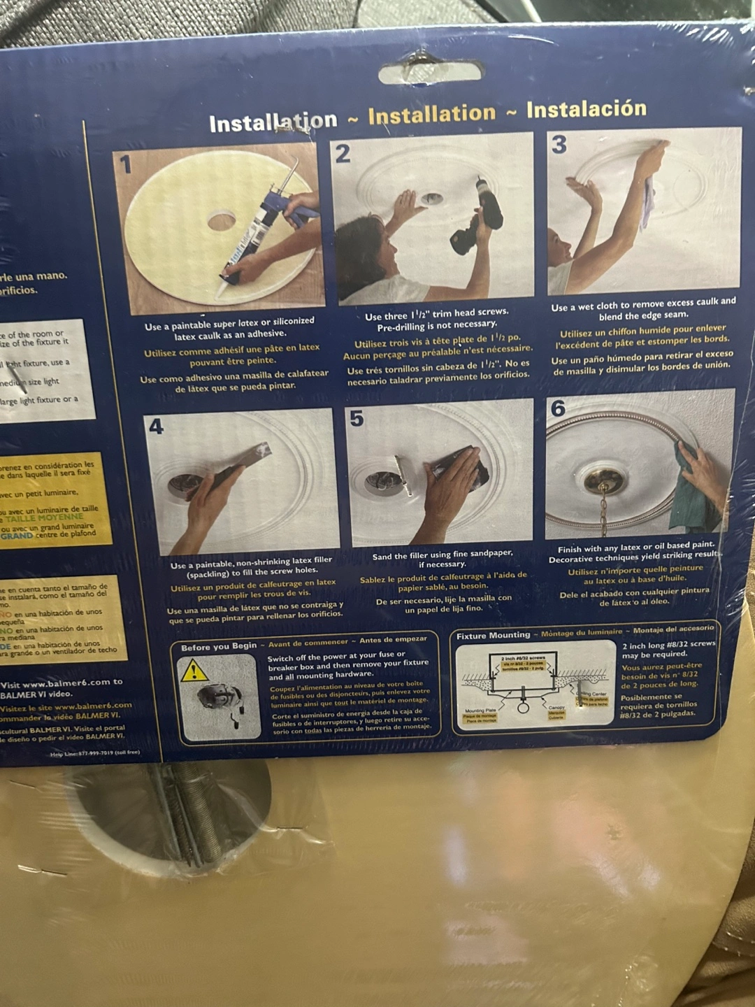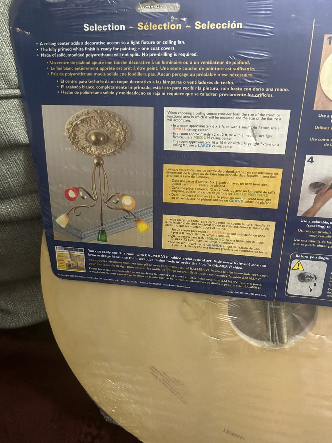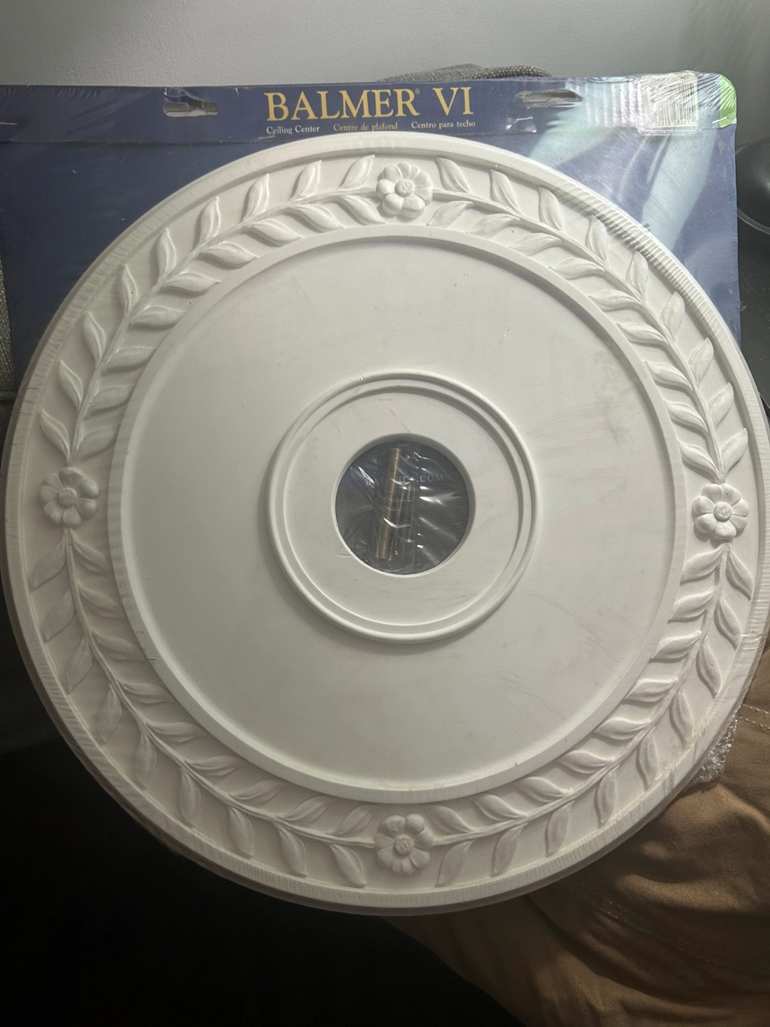 White ceiling medallion, ready to paint, comes with instructions and hardware. Decorative ceiling accent for a light fixture or fan.