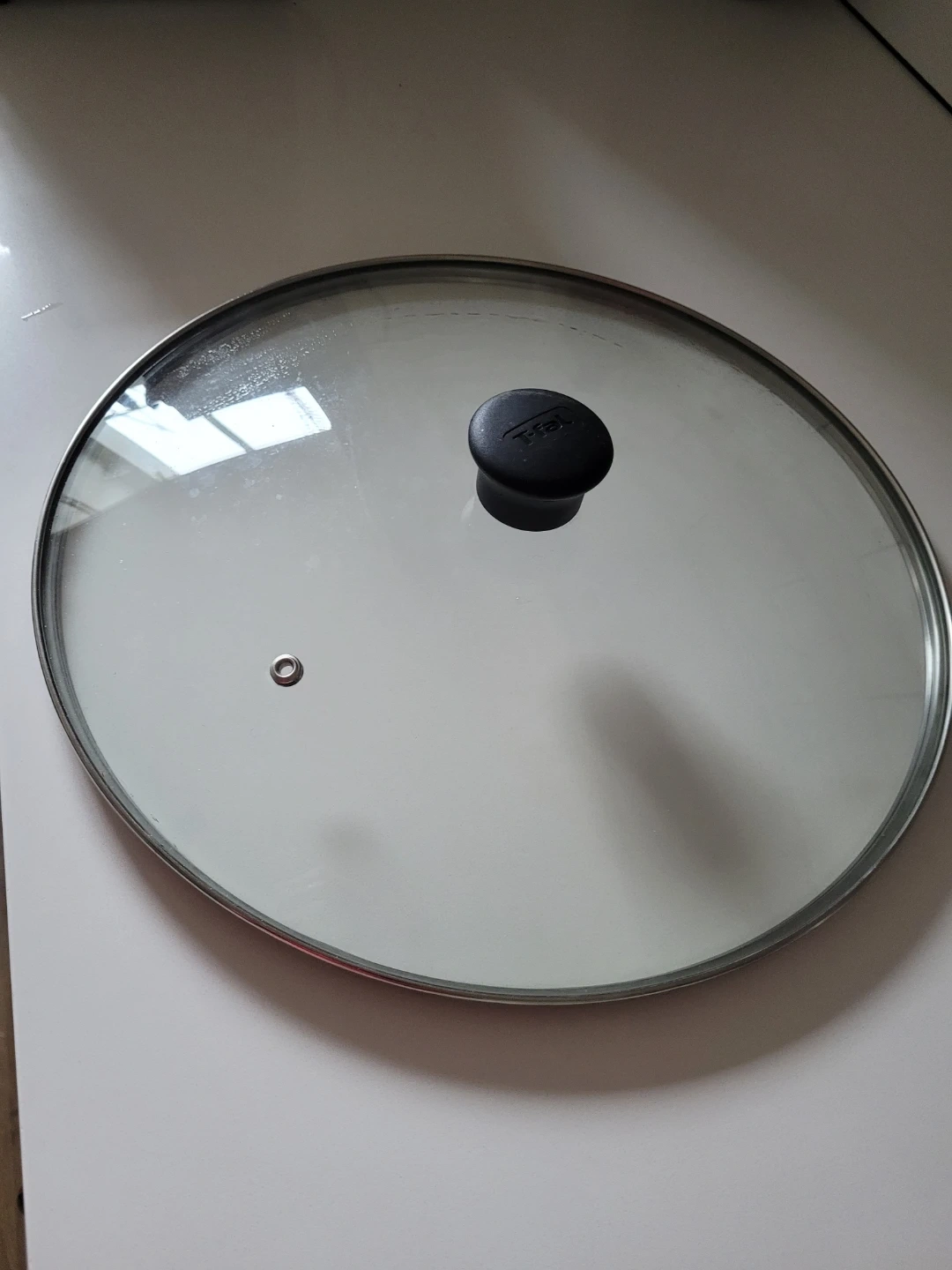 This is a T-fal glass pot lid. It measures 14 ins (35.5cm) across. It has a metal rim and a black plastic handle.