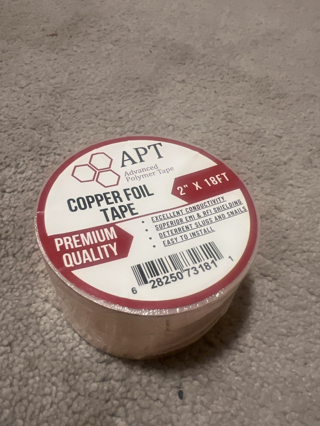 Selling a roll of APT Advanced Polymer Tape copper foil tape. It's 2 inches by 18 feet and of premium quality. This tape offers excellent conductivity and provides superior EMI & RFI shielding. It's also great for deterring slugs and snails, and it's easy to install