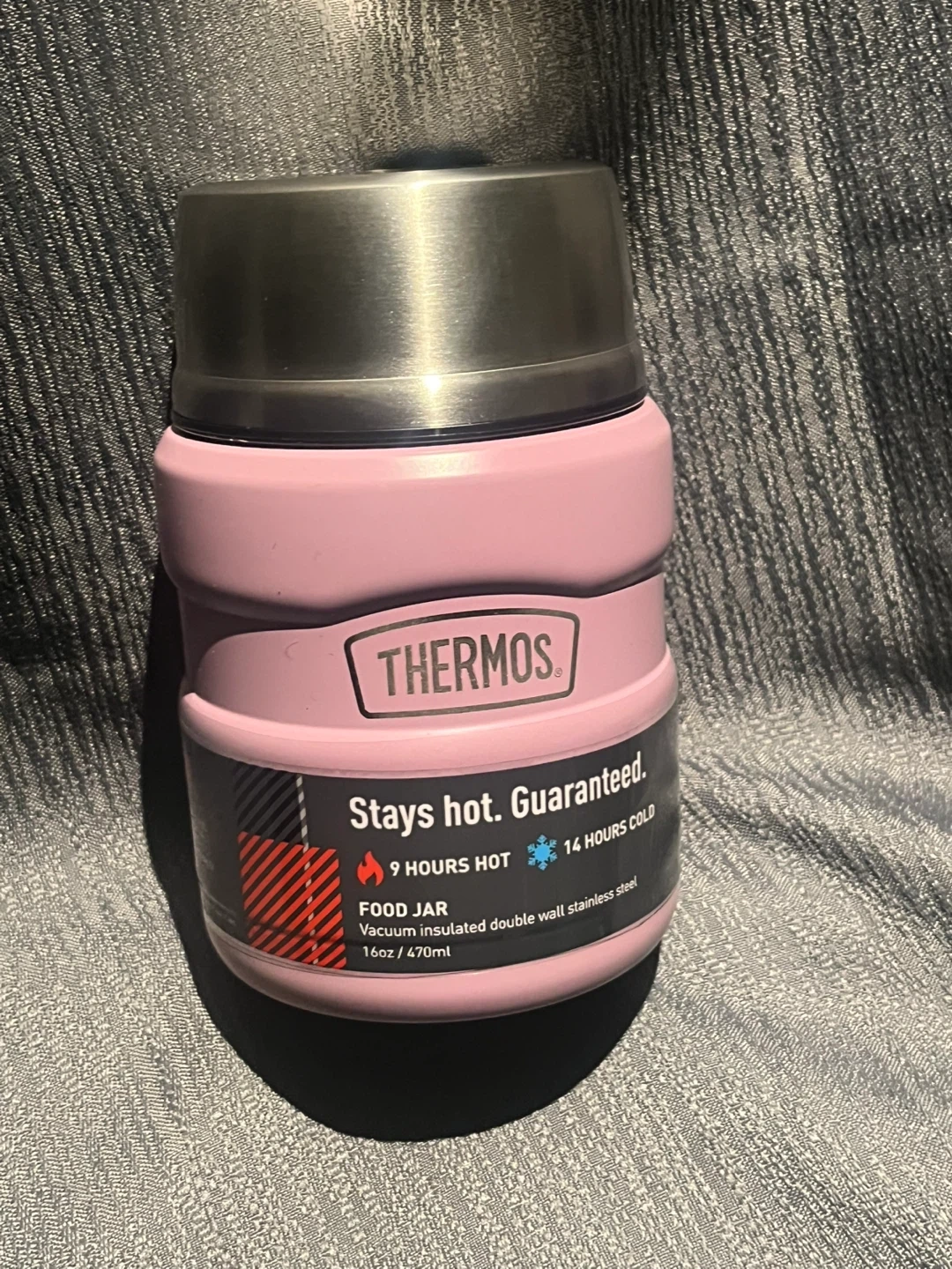 Selling a pink Thermos food jar! It's a 16oz (470ml) vacuum insulated double wall stainless steel container. Stays hot for 9 hours and cold for 14 hours, guaranteed! Perfect for soups, stews, or keeping your lunch fresh.