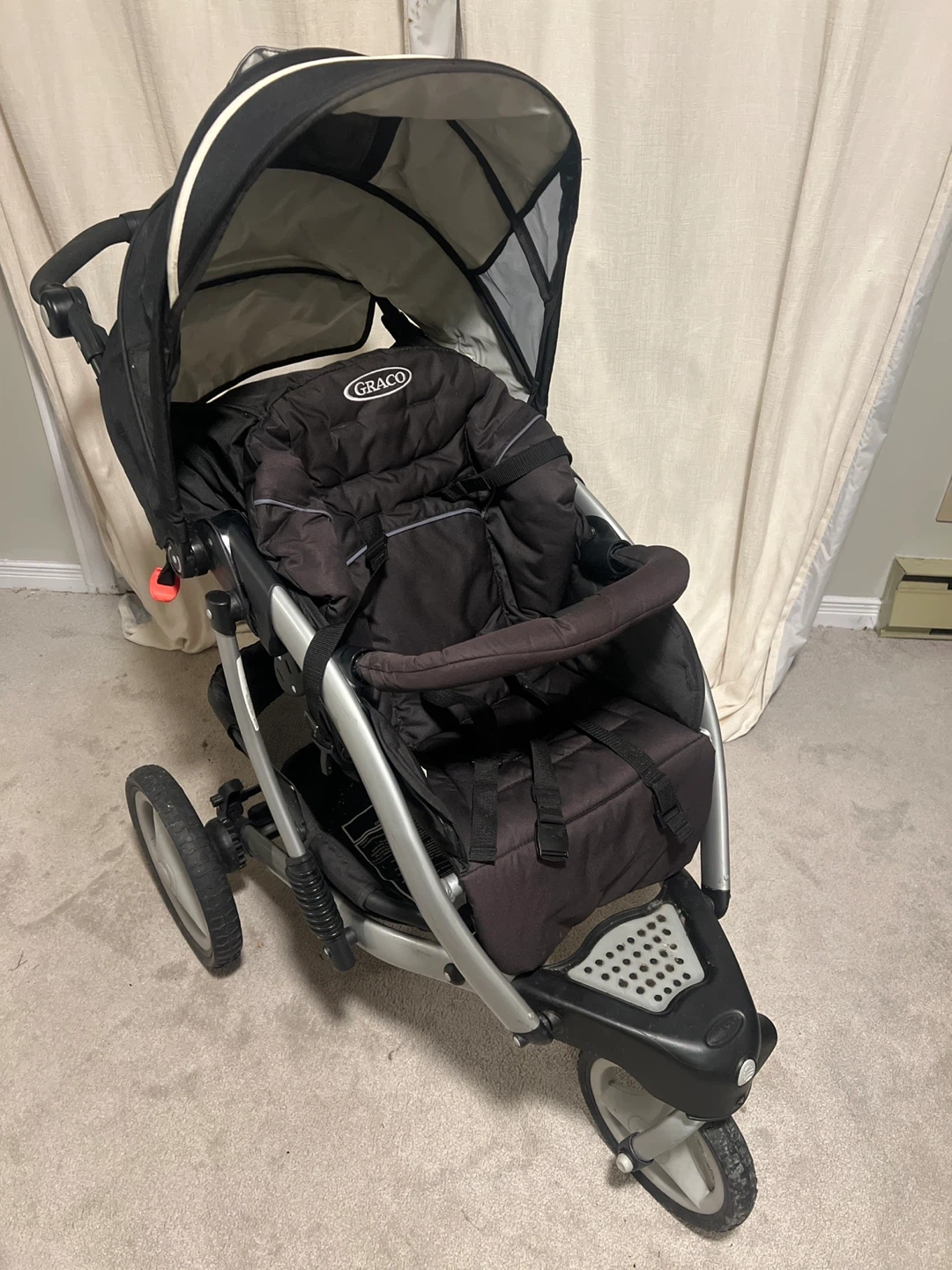 Selling a used Graco stroller in black. It's in excellent condition and ready for a new home. Perfect for walks around the neighbourhood or trips to the park!
