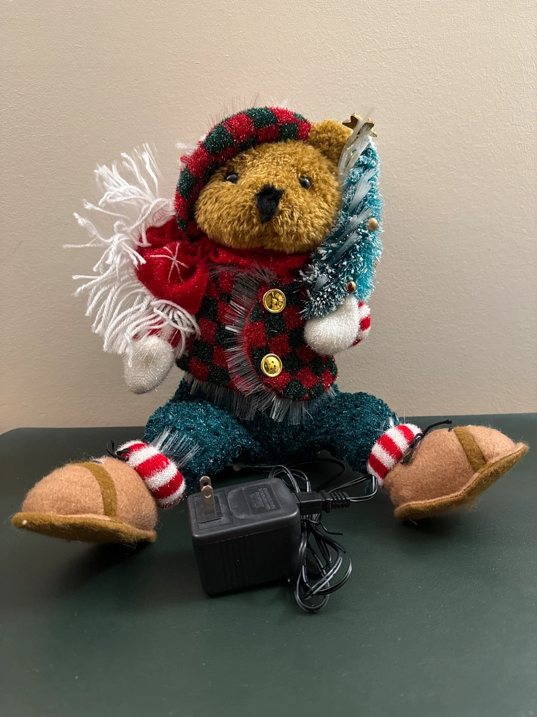 86Here's a cute animated Christmas teddy bear decoration that lights up! It's wearing a festive outfit and holding a Christmas tree. Plug in required. 30cm tall