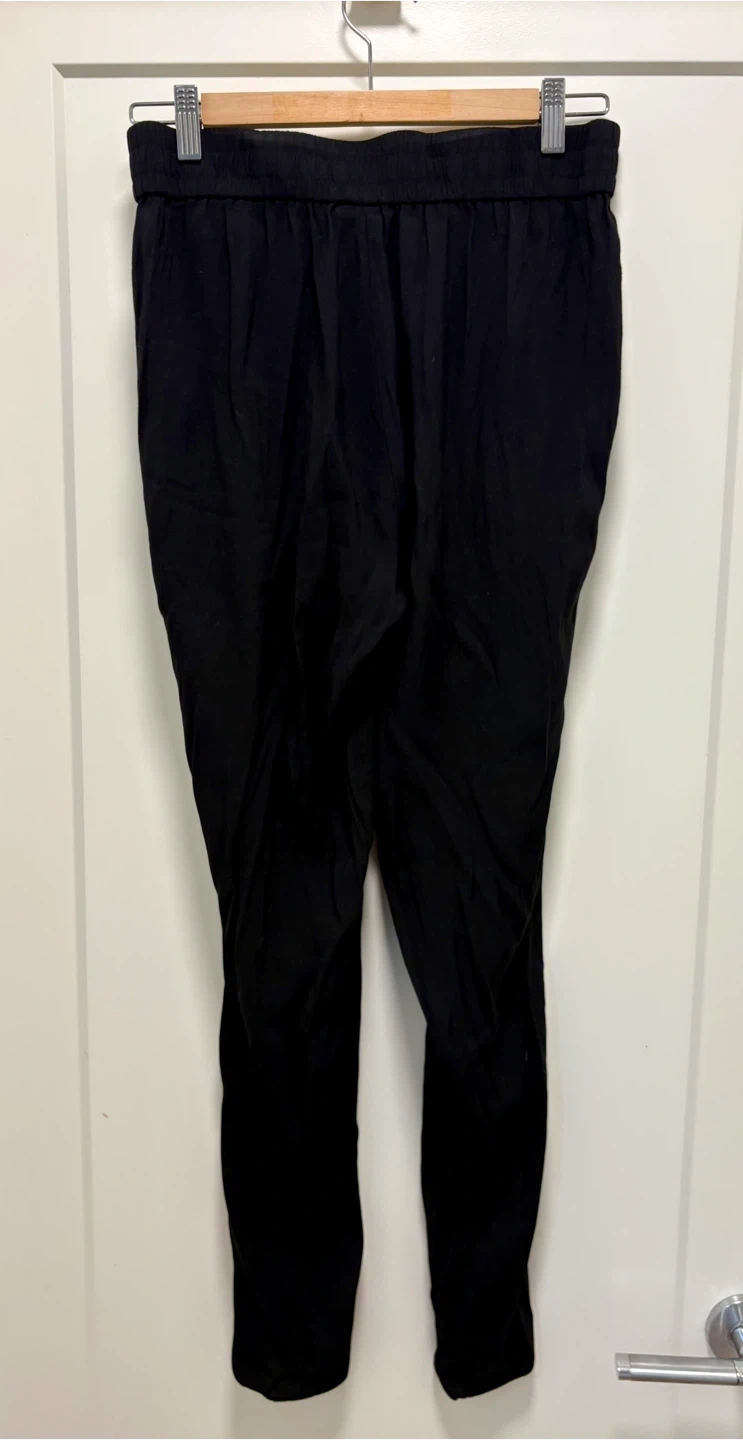 Selling a pair of Ever New black pants in size 4. These pants are in great condition and feature a comfortable elastic waistband and stylish zipper details near the pockets. Perfect for a casual or dressed-up look!