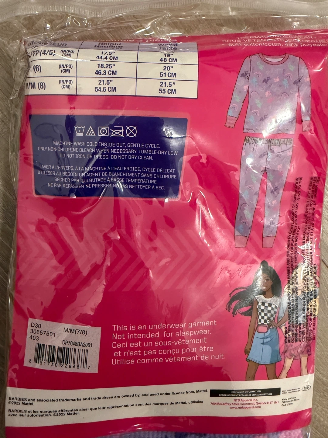 Selling a brand new Barbie thermal underwear set in size M/M (7/8)! This cute two-piece set features a fun unicorn and rainbow pattern on a soft purple background. Perfect for keeping your little one warm and cozy during the colder months! The packaging indicates it's made of 60% cotton and 40% polyester.