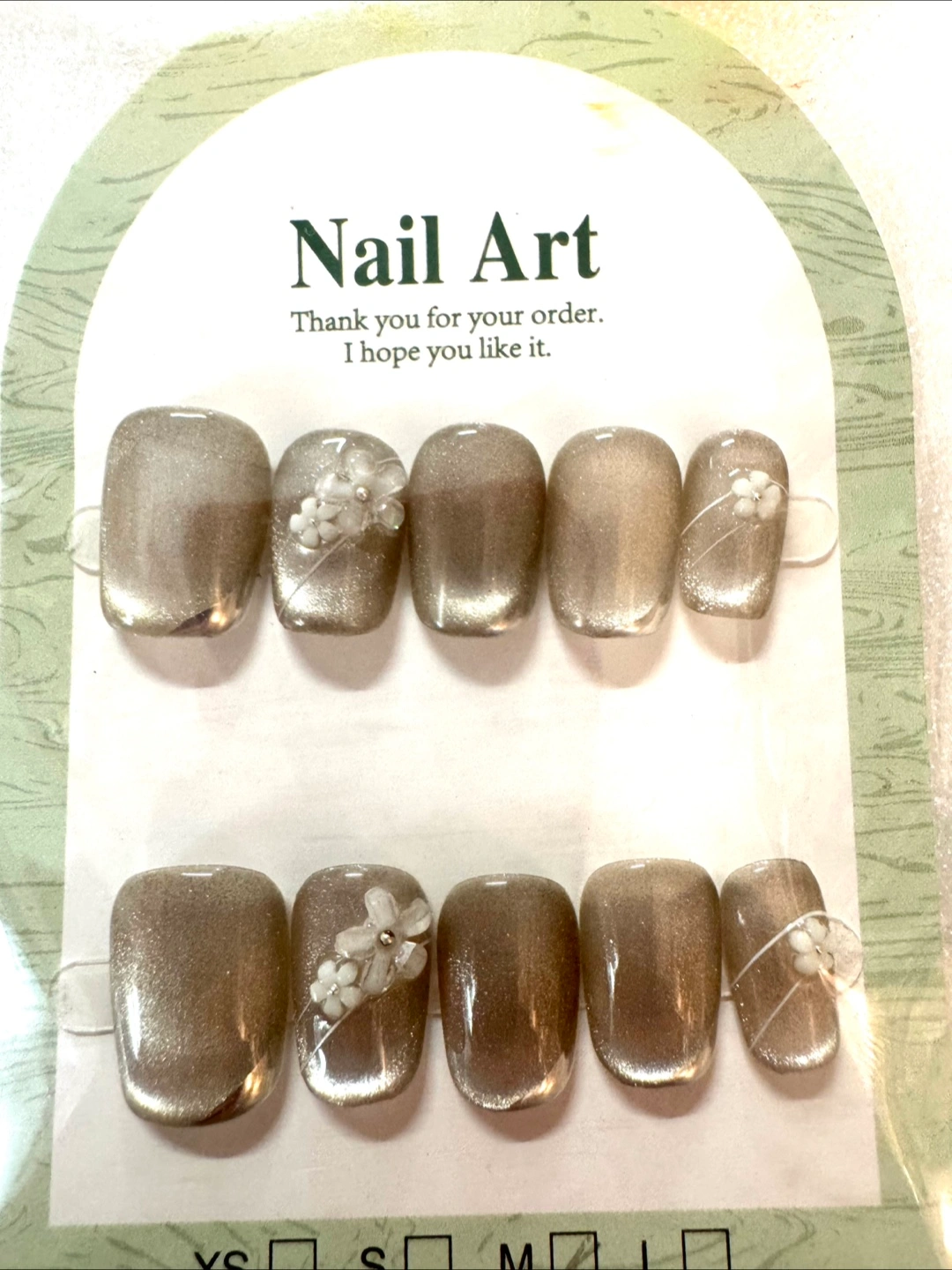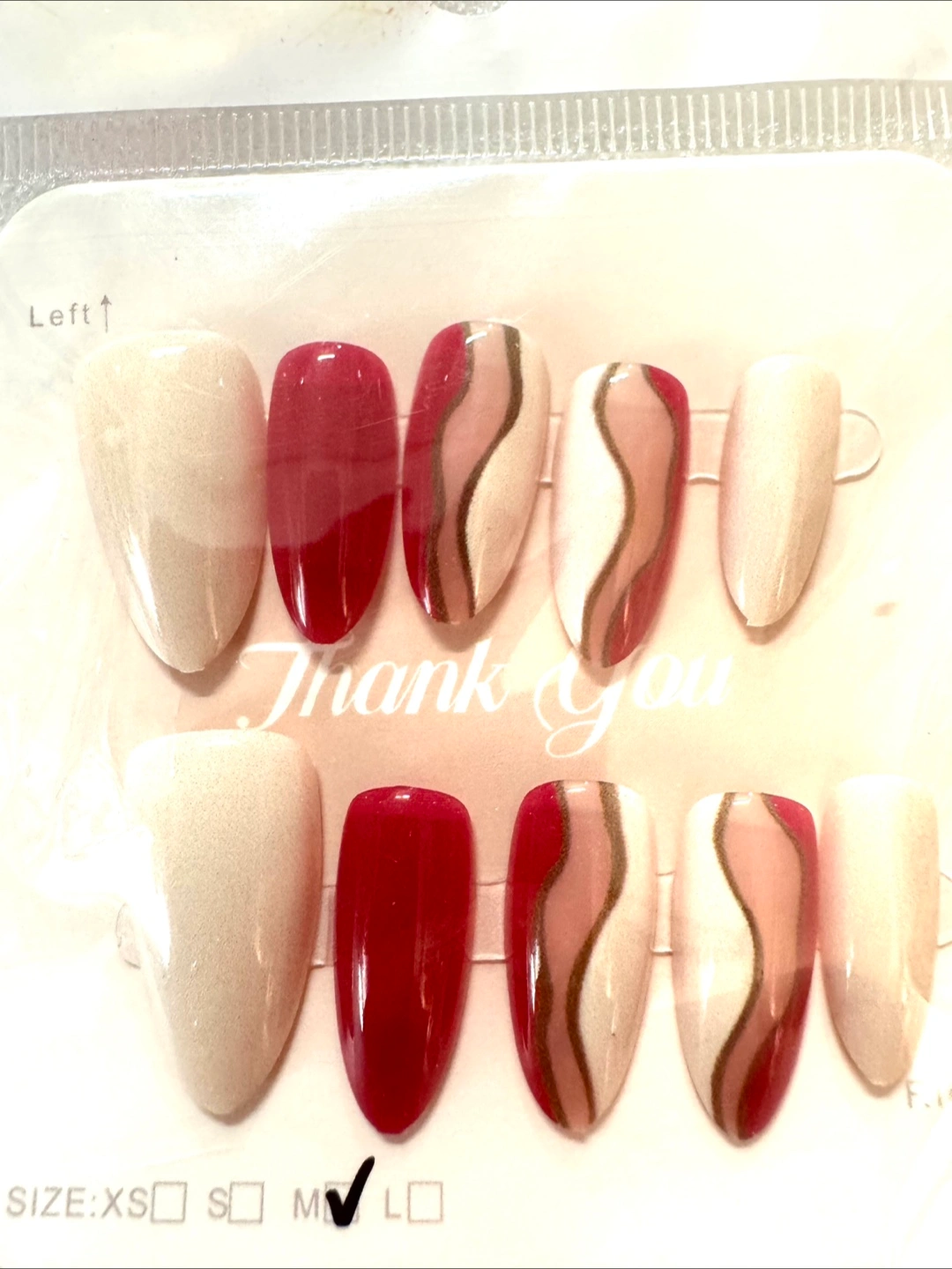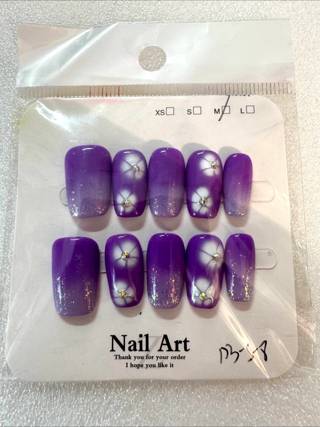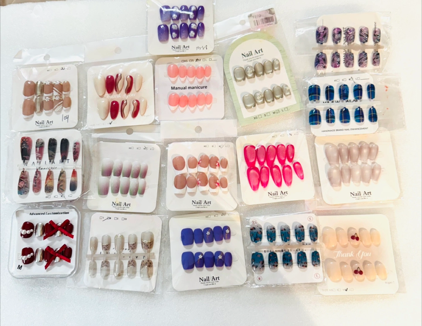 I'm selling sets of press-on nails in a size medium! They're brand new and come in a variety of designs, including cherry, floral, and abstract patterns. Perfect for adding a touch of style to your look! $3 EACH
