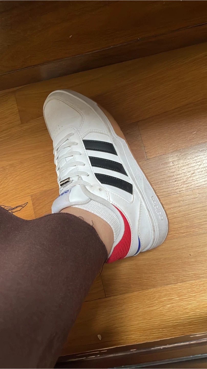 Selling a pair of Adidas sneakers. They're white with the classic black stripes. The soles have some wear, but they're still in good condition for everyday use
