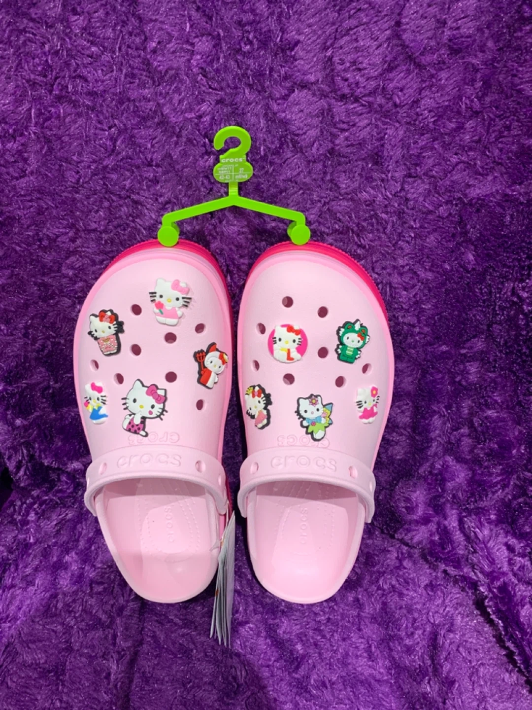 1000+Selling a pair of Crocs Classic Stacked Clogs in a cute Hello Kitty design! They're pink and in US size 9 women’s These clogs are in great condition and ready for a new home. They originally retailed for $84.99