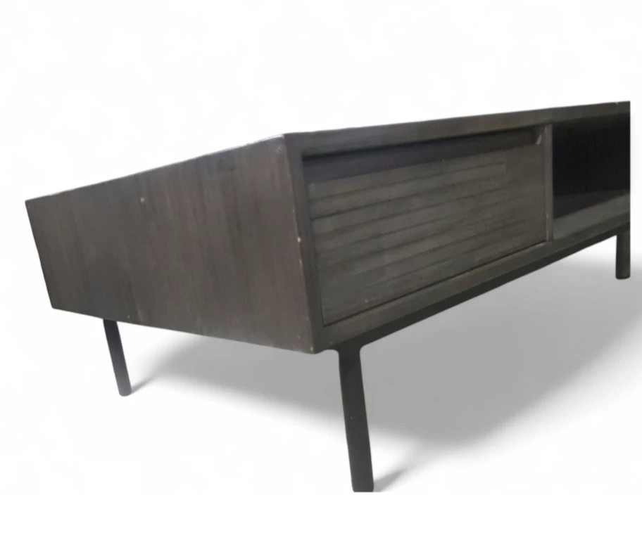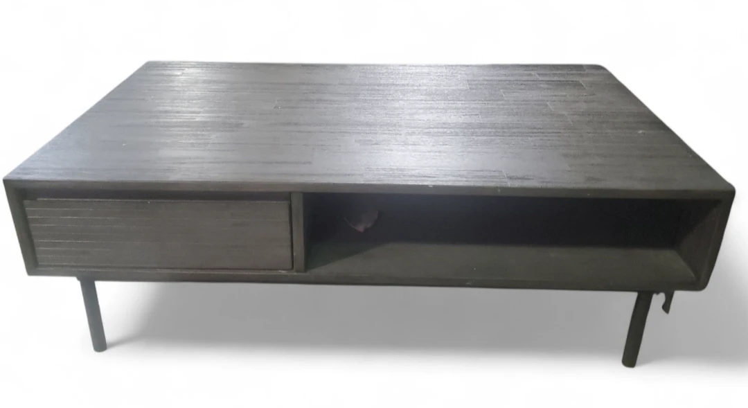 Selling a coffee table with a dark brown wood finish. It features a drawer on one side and an open shelf on the other. The table has a modern design with straight legs. It’s in great shape and ready for a new home!Modern Wood Coffee Table – Drawer & Open Shelf (47” x 27” x 16”)