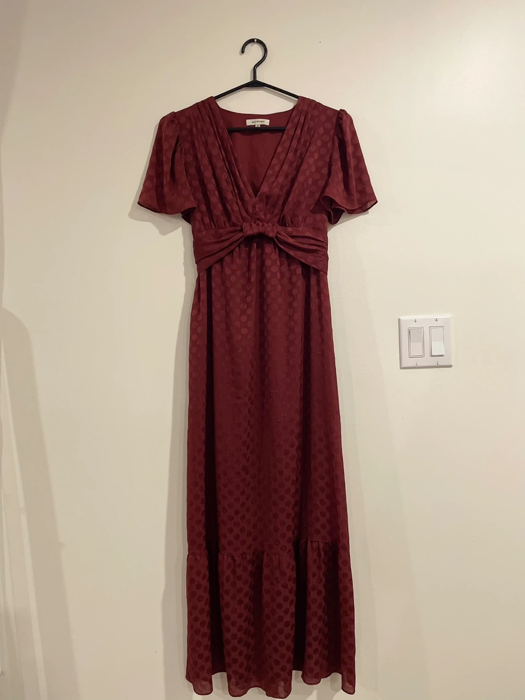 Selling a beautiful Max Studio maxi dress in a rich burgundy colour with a subtle polka dot pattern. It's a size XS and in great condition.