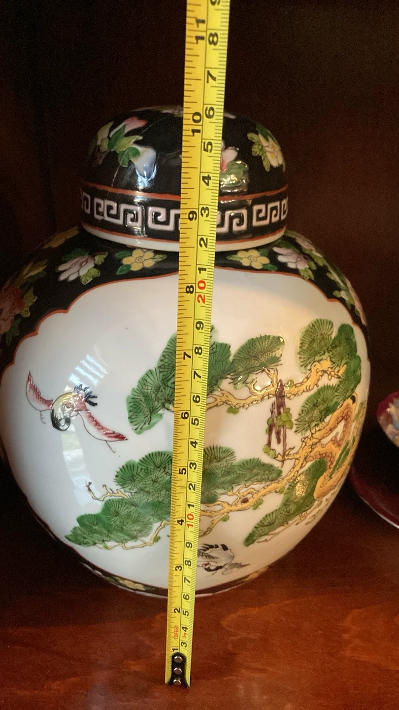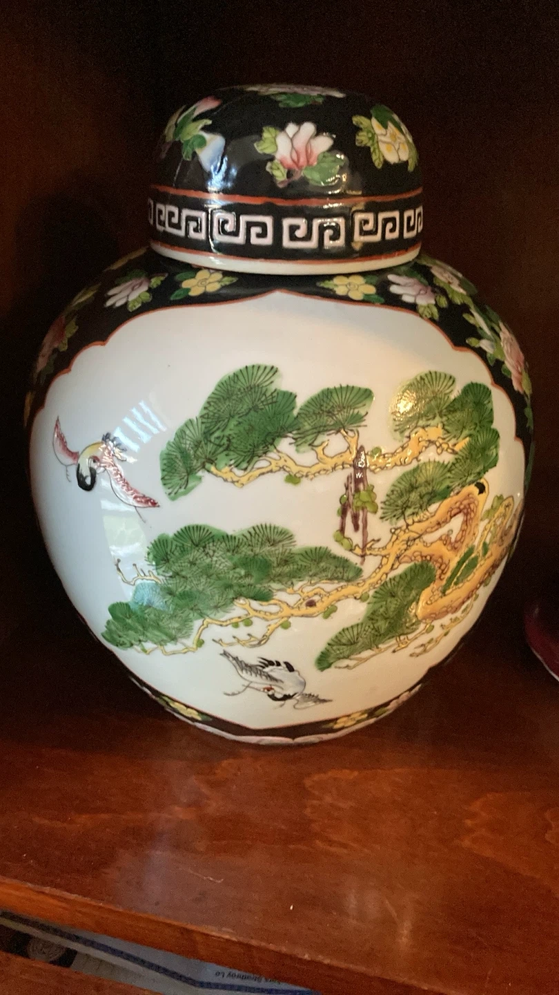 Selling a beautiful vintage ceramic vase with a lid. It features a lovely floral design and stands approximately 8 inches tall. Please note there is a crack and a chip on the inside of a small bowl.