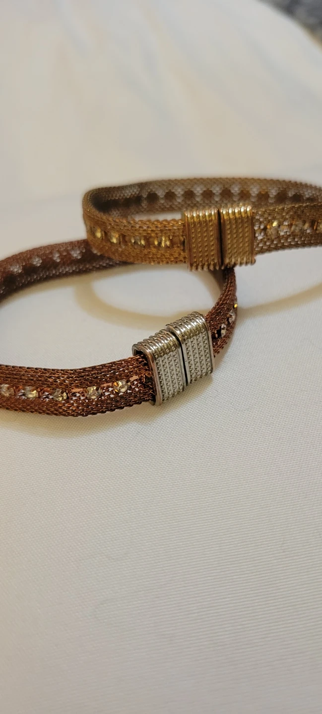 Selling two stylish mesh bracelets! They're in great condition and ready to add a touch of elegance to any outfit. The bracelets feature unique metallic accents and a comfortable fit. Perfect for everyday wear or special occasions