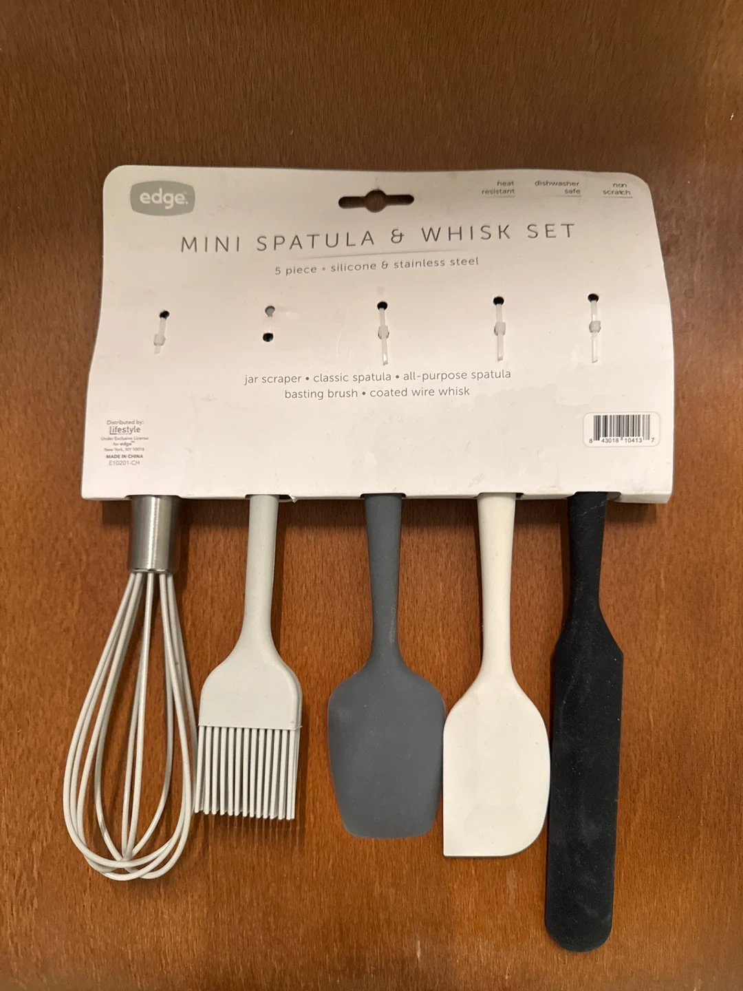 Free Edge mini spatula and whisk set! This set includes 5 pieces made of silicone and stainless steel. It's heat resistant, dishwasher safe, and non-scratch. Perfect for any kitchen! Brush has been gently used - other items new!